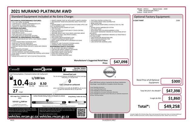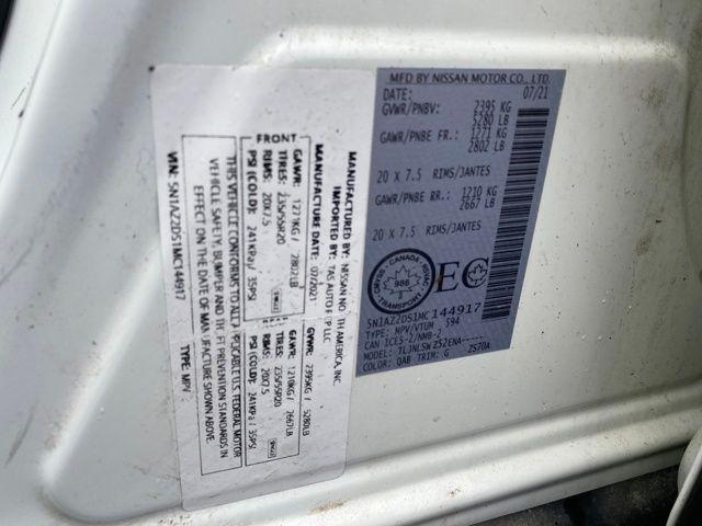 AM/FM/CD/MP3/WMA Audio System, Exterior Parking Camera Rear, Navigation system: NissanConnect Navigation, NissanConnect featuring Apple CarPlay and Android Auto, NissanConnect Services Powered By SiriusXM, Power Liftgate, Speed control, Wheels: 20" Dark Hyper Silver, 11 Speakers, 4-Wheel Disc Brakes, 4.667 Axle Ratio, ABS brakes, Air Conditioning, Alloy wheels, AM/FM radio: SiriusXM, Auto High-beam Headlights, Auto tilt-away steering wheel, Auto-dimming Rear-View mirror, Automatic temperature control, Blind Spot Warning, Brake assist, Bumpers: body-color, CD player, Child-Seat-Sensing Airbag, Delay-off headlights, Driver door bin, Driver vanity mirror, Dual front impact airbags, Dual front side impact airbags, Electronic Stability Control, Emergency communication system: NissanConnect Services (first 6 months included), Four wheel independent suspension, Front anti-roll bar, Front Bucket Seats, Front Center Armrest, Front dual zone A/C, Front fog lights, Front reading lights, Fully automatic headlights, Garage door transmitter: HomeLink, Heated & Ventilated Front Bucket Seats, Heated door mirrors, Heated front seats, Heated rear seats, Heated steering wheel, Illuminated entry, Knee airbag, Low tire pressure warning, Memory seat, Occupant sensing airbag, Outside temperature display, Overhead airbag, Overhead console, Panic alarm, Passenger door bin, Passenger vanity mirror, Power door mirrors, Power driver seat, Power moonroof, Power passenger seat, Power steering, Power windows, Radio data system, Rear anti-roll bar, Rear reading lights, Rear seat center armrest, Rear side impact airbag, Rear window defroster, Rear window wiper, Remote keyless entry, Roof rack: rails only, Security system, Semi-Aniline Leather-Appointed Seat Trim, Speed-sensing steering, Speed-Sensitive Wipers, Split folding rear seat, Spoiler, Steering wheel memory, Steering wheel mounted audio controls, Tachometer, Telescoping steering wheel, Tilt steering wheel, Traction control, Trip computer, Turn signal indicator mirrors, Variably intermittent wipers, Ventilated front seats, ALL WHEEL DRIVE, AM/FM/CD/MP3/WMA Audio System, Exterior Parking Camera Rear, Navigation system: NissanConnect Navigation, NissanConnect featuring Apple CarPlay and Android Auto, NissanConnect Services Powered By SiriusXM, Power Liftgate, Speed control, Wheels: 20" Dark Hyper Silver.