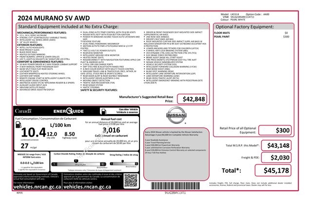 AM/FM/CD/MP3/WMA Audio System, NissanConnect featuring Apple CarPlay and Android Auto, Speed control, 4-Wheel Disc Brakes, 4.667 Axle Ratio, 6 Speakers, ABS brakes, Air Conditioning, Alloy wheels, AM/FM radio: SiriusXM, Auto High-beam Headlights, Auto-dimming Rear-View mirror, Automatic temperature control, Blind Spot Warning, Brake assist, Bumpers: body-color, CD player, Child-Seat-Sensing Airbag, Compass, Delay-off headlights, Driver door bin, Driver vanity mirror, Dual front impact airbags, Dual front side impact airbags, Electronic Stability Control, Four wheel independent suspension, Front anti-roll bar, Front Bucket Seats, Front Center Armrest, Front dual zone A/C, Front fog lights, Front reading lights, Fully automatic headlights, Heated door mirrors, Heated Front Bucket Seats, Heated front seats, Illuminated entry, Knee airbag, Leather steering wheel, Leatherette-Appointed Seat Trim, Low tire pressure warning, Occupant sensing airbag, Outside temperature display, Overhead airbag, Overhead console, Panic alarm, Passenger door bin, Passenger vanity mirror, Power door mirrors, Power driver seat, Power passenger seat, Power steering, Power windows, Radio data system, Rear anti-roll bar, Rear reading lights, Rear seat center armrest, Rear side impact airbag, Rear window defroster, Rear window wiper, Remote keyless entry, Security system, Speed-sensing steering, Speed-Sensitive Wipers, Split folding rear seat, Spoiler, Steering wheel mounted audio controls, Tachometer, Telescoping steering wheel, Tilt steering wheel, Traction control, Trip computer, Turn signal indicator mirrors, Variably intermittent wipers, Wheels: 18" Machined Aluminum-Alloy, ALL WHEEL DRIVE, AM/FM/CD/MP3/WMA Audio System, NissanConnect featuring Apple CarPlay and Android Auto, Speed control.