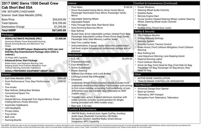 Bose Speaker System, Chrome Recovery Hooks, Denali Ultimate Package, Enhanced Driver Alert Package, Forward Collision Alert, Integrated Trailer Brake Controller, IntelliBeam Automatic High Beam On/Off Headlight, Lane Keep Assist, Low Speed Forward Automatic Braking, Power Sunroof, Tri-Mode Power Steps, Wheels: 22" Aluminum w/Premium Paint, 110-Volt AC Power Outlet, 150 Amp Alternator, 1st & 2nd Row Color-Keyed Carpeted Floor Mats, 2-Speed Active Electronic AutoTrac Transfer Case, 4-Wheel Disc Brakes, 6" Rectangular Chromed Tubular Assist Steps, 7 Speakers, 8" Multi-Color Customizable Driver Display, ABS brakes, Active Noise Cancellation, Adaptive suspension, Adjustable pedals, Air Conditioning, Alloy wheels, AM/FM radio, Auto High-beam Headlights, Auto-dimming door mirrors, Auto-Dimming Inside Rear-View Mirror, Auto-dimming Rear-View mirror, Automatic temperature control, Body Color Lower Front Bumper, Body Color Rear Bumper w/Cornersteps, Bodyside moldings, Brake assist, Bumpers: body-color, CD player, Chrome Bodyside Moldings, Chrome Door Handles, Chrome Mirror Caps, Color-Keyed Carpeting, Compass, Deep-Tinted Glass, Delay-off headlights, Driver & Front Passenger Illuminated Vanity Mirrors, Driver door bin, Driver vanity mirror, Dual front impact airbags, Dual front side impact airbags, Dual-Zone Automatic Climate Control, Electric Rear-Window Defogger, Electronic Stability Control, Emergency communication system: OnStar Guidance, Exterior Parking Camera Rear, EZ Lift & Lower Tailgate, Floor Mounted Console, Front & Rear All-Weather Floor Mats, Front anti-roll bar, Front Center Armrest w/Storage, Front dual zone A/C, Front fog lights, Front Frame-Mounted Black Recovery Hooks, Front Full Feature Power Reclining Bucket Seats, Front reading lights, Front wheel independent suspension, Fully automatic headlights, Garage door transmitter: HomeLink, HD Radio, Heated & Ventilated Front Bucket Seats, Heated door mirrors, Heated front seats, Heated steering wheel, Illuminated entry, Leather Wrapped Heated Steering Wheel, Low tire pressure warning, MagneRide Magnetic Ride Control Suspension, Manual Tilt/Telescoping Steering Column, Memory seat, Navigation System, Occupant sensing airbag, OnStar 3 Month Guidance Plan, OnStar w/4G LTE, Outside temperature display, Overhead airbag, Overhead console, Panic alarm, Passenger door bin, Passenger vanity mirror, Perforated Leather Appointed Seat Trim, Polished Exhaust Tip, Power Adjustable Pedals, Power door mirrors, Power driver seat, Power Folding & Adjustable Heated Outside Mirrors, Power passenger seat, Power Sliding Rear Window w/Defogger, Power steering, Power windows, Power Windows w/Driver Express Up & Down, Preferred Equipment Group 5SA, Radio data system, Radio: AM/FM Stereo w/8" Diagonal Color Touch Nav., Rear 60/40 Folding Bench Seat (Folds Up), Rear reading lights, Rear seat center armrest, Rear step bumper, Rear Vision Camera, Rear Wheelhouse Liners, Rear window defroster, Remote Keyless Entry, Remote keyless entry, Remote Locking Tailgate, Remote Vehicle Starter System, Security system, Single Slot CD/MP3 Player, SiriusXM Satellite Radio, Speed control, Speed-sensing steering, Split folding rear seat, Steering Wheel Audio Controls, Steering wheel mounted audio controls, Tachometer, Telescoping steering wheel, Theft Deterrent System (Unauthorized Entry), Thin Profile LED Fog Lamps, Tilt steering wheel, Traction control, Trailering Equipment, Trip computer, Turn signal indicator mirrors, Ultrasonic Front & Rear Park Assist, Universal Home Remote, Variably intermittent wipers, Ventilated front seats, Voltmeter, Wheels: 20" x 9" Ultra Bright Machined Aluminum, Wireless Charging, Bose Speaker System, Chrome Recovery Hooks, Denali Ultimate Package, Enhanced Driver Alert Package, Forward Collision Alert, Integrated Trailer Bra