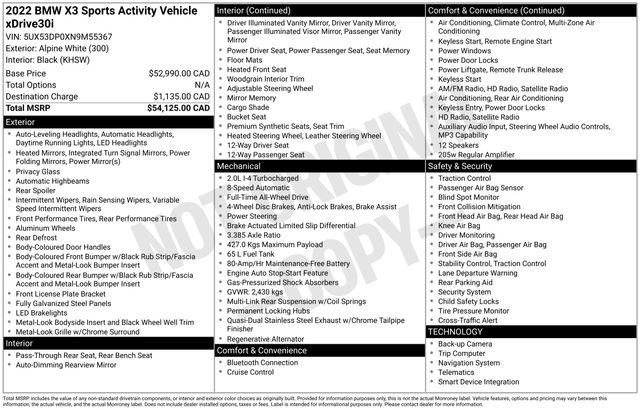 Connected Package Pro, Navigation System, 12 Speakers, 3.385 Axle Ratio, 4-Wheel Disc Brakes, ABS brakes, Air Conditioning, Alloy wheels, AM/FM Radio, AM/FM radio: SiriusXM with 360L, Apple CarPlay & Android Auto Compatibility, Auto High-beam Headlights, Auto-dimming door mirrors, Auto-dimming Rear-View mirror, Automatic temperature control, BMW Assist eCall, BMW TeleServices, Brake assist, Bumpers: body-color, ConnectedDrive Services, Delay-off headlights, Driver door bin, Driver vanity mirror, Dual front impact airbags, Dual front side impact airbags, Electronic Stability Control, Emergency communication system: BMW Assist eCall, Enhanced Bluetooth, Exterior Parking Camera Rear, Four wheel independent suspension, Front anti-roll bar, Front Bucket Seats, Front Center Armrest, Front dual zone A/C, Front reading lights, Fully automatic headlights, Garage door transmitter, Genuine wood dashboard insert, Genuine wood door panel insert, Heated door mirrors, Hi-Fi Sound System, Illuminated entry, Knee airbag, Low tire pressure warning, Memory seat, Navigation, Occupant sensing airbag, Outside temperature display, Overhead airbag, Panic alarm, Passenger door bin, Passenger vanity mirror, Perforated SensaTec Upholstery, Power door mirrors, Power driver seat, Power Front Seats, Power Liftgate, Power passenger seat, Power steering, Power windows, Radio data system, Rain sensing wipers, Rear air conditioning, Rear anti-roll bar, Rear reading lights, Rear seat center armrest, Rear window defroster, Rear window wiper, Remote keyless entry, Roof rack: rails only, Security system, SiriusXM w/360L, Speed control, Speed-sensing steering, Speed-Sensitive Wipers, Split folding rear seat, Spoiler, Sport Seats, Sport steering wheel, Steering wheel mounted audio controls, Tachometer, Telescoping steering wheel, Tilt steering wheel, Traction control, Trip computer, Turn signal indicator mirrors, Variably intermittent wipers, Wheels: 19" x 7.5" Y-Spoke (Style 693), WiFi Hotspot, Connected Package Pro, Navigation System.