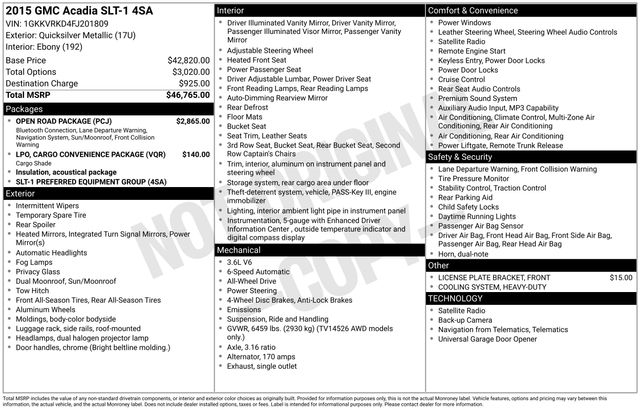 10 Speakers, 19" x 7.5" Aluminum (4) Wheels, 3.16 Axle Ratio, 3rd row seats: split-bench, 4-Wheel Disc Brakes, 7-Passenger Seating (2-2-3 Seating Configuration), 8-Way Power Driver Seat, 8-Way Power Passenger Seat Adjuster, ABS brakes, Acoustical Insulation Package, Air Conditioning, Alloy wheels, AM/FM radio: SiriusXM, Auto-dimming Rear-View mirror, Automatic temperature control, Body-Color Bodyside Moldings, Body-Color Heated Power-Adjustable Outside Mirrors, Bodyside moldings, Bose Premium 10-Speaker Audio System, Brake assist, Bumpers: body-color, Cargo Area Shade Cover, Cargo Convenience Package, Cargo Net, Carpeted Removable Front 2nd & 3rd Row Floor Mats, CD player, Compass, Delay-off headlights, Driver door bin, Driver vanity mirror, Dual front impact airbags, Dual front side impact airbags, Dual SkyScape 2-Panel Power Sunroof, Electronic Stability Control, Emergency communication system: OnStar Directions & Connections, Exterior Parking Camera Rear, Forward Collision Alert & Lane Departure Warning, Four wheel independent suspension, Front anti-roll bar, Front Bucket Seats, Front Center Armrest w/Storage, Front dual zone A/C, Front fog lights, Front License Plate Bracket, Front reading lights, Fully automatic headlights, Garage door transmitter, Heated door mirrors, Heated Driver & Front Passenger Seats, Heated front seats, Heavy-Duty Cooling System, Illuminated entry, Inside Rear-View Auto-Dimming Mirror, Leather Shift Knob, Leather-Appointed Seat Trim, Leather-Wrapped Steering Wheel, Low tire pressure warning, NavTraffic, Occupant sensing airbag, Open Road Package, Outside temperature display, Overhead airbag, Overhead console, Panic alarm, Passenger door bin, Passenger vanity mirror, Power door mirrors, Power driver seat, Power Liftgate, Power passenger seat, Power Rear Liftgate Body, Power steering, Power windows, Power Windows w/Driver Express-Down, Preferred Equipment Group 4SA, Radio data system, Radio: Color Touch AM/FM/CD w/IntelliLink, Radio: Color Touch Navigation w/IntelliLink, Rear air conditioning, Rear anti-roll bar, Rear audio controls, Rear Audio System Controls, Rear Parking Sensors, Rear reading lights, Rear window defroster, Rear window wiper, Remote keyless entry, Remote Vehicle Start, Roof rack: rails only, Security system, Single Outlet Exhaust, SiriusXM Satellite Radio, Speed control, Speed-sensing steering, Spoiler, Steering Wheel Mounted Audio Controls, Steering wheel mounted audio controls, Tachometer, Telescoping steering wheel, Tilt & Telescopic Steering Column, Tilt steering wheel, Traction control, Trailer Hitch, Trailering Equipment, Tri-Zone Automatic Climate Control, Trip computer, Turn signal indicator mirrors, Universal Home Remote, Variable Effort Power Steering, Variably intermittent wipers, Voltmeter.