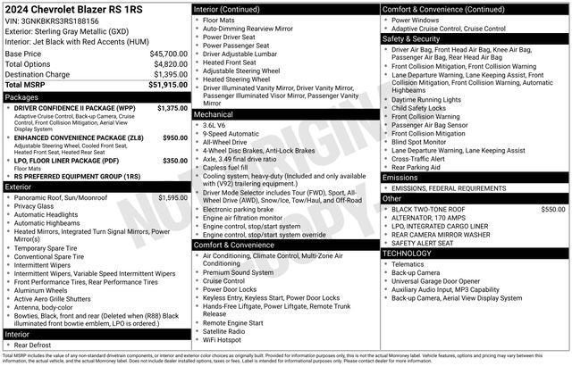 Adaptive Cruise Control, Driver Confidence II Package, Enhanced Automatic Emergency Braking, Enhanced Convenience Package, HD Surround Vision, Heated Rear Outboard Seating Positions, Memory Settings For Driver Seat & Exterior Mirrors, Navigation System, Power Tilt & Telescoping Steering Column, Rear Camera Mirror, Safety Alert Seat, Ventilated Driver & Front Passenger Seats, 1st & 2nd Row All-Weather Floor Liners (LPO), 3.49 Final Drive Axle Ratio, 4-Wheel Disc Brakes, 6-Way Power Front Passenger Seat Adjuster, 8 Speakers, 8-Way Power Driver Seat Adjuster, ABS brakes, Air Conditioning, Alloy wheels, AM/FM radio: SiriusXM with 360L, Apple CarPlay/Android Auto, Auto High-beam Headlights, Auto-dimming door mirrors, Auto-dimming Rear-View mirror, Automatic temperature control, Black 2-Tone Roof, Bose Premium 8-Speaker Audio System Feature, Brake assist, Bumpers: body-color, Child-Seat-Sensing Airbag, Compass, Delay-off headlights, Driver door bin, Driver vanity mirror, Dual front impact airbags, Dual front side impact airbags, Electronic Stability Control, Emergency communication system: OnStar and Chevrolet connected services capable, Floor Liner Package (LPO), Four wheel independent suspension, Front anti-roll bar, Front Bucket Seats, Front Center Armrest, Front dual zone A/C, Front reading lights, Fully automatic headlights, Garage door transmitter, Heated door mirrors, Heated Driver & Front Passenger Seats, Heated front seats, Heated Steering Wheel, Heated steering wheel, Illuminated entry, Integrated Cargo Liner (LPO), Knee airbag, Leather Shift Knob, Leather steering wheel, Low tire pressure warning, Occupant sensing airbag, Outside temperature display, Overhead airbag, Overhead console, Panic alarm, Passenger door bin, Passenger vanity mirror, Perforated Leather-Appointed Seat Trim, Power door mirrors, Power Driver Lumbar Control, Power driver seat, Power Liftgate, Power Panoramic Tilt-Sliding Sunroof, Power passenger seat, Power steering, Power windows, Preferred Equipment Group 1RS, Premium audio system: Chevrolet Infotainment 3 Premium, Radio data system, Radio: Chevrolet Infotainment 3 Premium System, Rear anti-roll bar, Rear Camera Mirror Washer, Rear reading lights, Rear seat center armrest, Rear window defroster, Rear window wiper, Remote keyless entry, Ride & Handling Suspension, Security system, SiriusXM w/360L, Speed control, Speed-sensing steering, Split folding rear seat, Spoiler, Steering wheel mounted audio controls, Tachometer, Telescoping steering wheel, Tilt steering wheel, Traction control, Trip computer, Turn signal indicator mirrors, Variably intermittent wipers, Voltmeter, Wheels: 20" Technical Gray Aluminum, Adaptive Cruise Control, Driver Confidence II Package, Enhanced Automatic Emergency Braking, Enhanced Convenience Package, HD Surround Vision, Heated Rear Outboard Seating Positions, Memory Settings For Driver Seat & Exterior Mirrors, Navigation System, Power Tilt & Telescoping Steering Column, Rear Camera Mirror, Safety Alert Seat, Ventilated Driver & Front Passenger Seats.