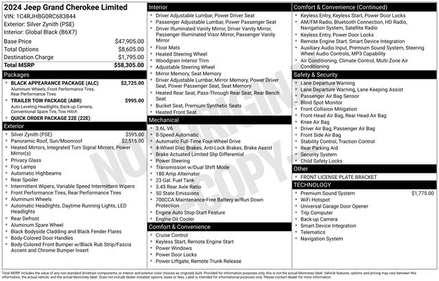 220 Amp Alternator, 7 & 4-Pin Wiring Harness, Automatic Headlamp Levelling System, Class IV Receiver Hitch, Heavy-Duty Engine Cooling, Navigation System, Rear Load Levelling Suspension, Trailer Hitch Zoom, Trailer Tow Package, 3.45 Rear Axle Ratio, 4-Wheel Disc Brakes, 506 Watt Amplifier, 6 Speakers, 9 Amplified Speakers w/Subwoofer, ABS brakes, Active Noise Control System, Air Conditioning, Alloy wheels, AM/FM radio: SiriusXM with 360L, Anti-whiplash front head restraints, Audio memory, Auto High-beam Headlights, Automatic temperature control, Black Appearance Package, Brake assist, Bumpers: body-color, Capri Leatherette Seats, Compass, Delay-off headlights, Driver door bin, Driver vanity mirror, Dual front impact airbags, Dual front side impact airbags, Dual-Pane Panoramic Sunroof, Electronic Stability Control, Emergency communication system, Four wheel independent suspension, Front anti-roll bar, Front Bucket Seats, Front Center Armrest w/Storage, Front dual zone A/C, Front fog lights, Front License Plate Bracket, Front reading lights, Fully automatic headlights, Garage door transmitter, Gloss Black Exterior Accents, Heated door mirrors, Heated front seats, Heated rear seats, Heated steering wheel, Illuminated entry, Knee airbag, Low tire pressure warning, Memory seat, Normal Duty Suspension, Occupant sensing airbag, Outside temperature display, Overhead airbag, Overhead console, Panic alarm, ParkView Rear Back-Up Camera, Passenger door bin, Passenger vanity mirror, Power door mirrors, Power driver seat, Power Liftgate, Power passenger seat, Power steering, Power windows, Quick Order Package 22E, Radio data system, Radio: Uconnect 5 Nav w/10.1" Display, Rear anti-roll bar, Rear reading lights, Rear window defroster, Rear window wiper, Remote keyless entry, Security system, Speed control, Speed-Sensitive Wipers, Split folding rear seat, Spoiler, Steering wheel mounted audio controls, Tachometer, Telescoping steering wheel, Tilt steering wheel, Traction control, Trip computer, Turn signal indicator mirrors, Variably intermittent wipers, Voltmeter, Wheels: 18" x 8" Polished/Painted Aluminum, Wheels: 20" x 8.5" Gloss Black Painted Aluminum, 220 Amp Alternator, 7 & 4-Pin Wiring Harness, Automatic Headlamp Levelling System, Class IV Receiver Hitch, Heavy-Duty Engine Cooling, Navigation System, Rear Load Levelling Suspension, Trailer Hitch Zoom, Trailer Tow Package.