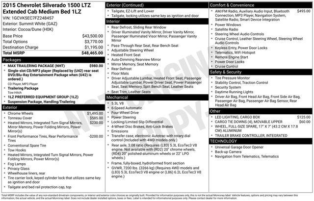 110-Volt AC Power Outlet, 150 Amp Alternator, 4.2" Diagonal Color Display Driver Info Center, 6 Speaker Audio System, Auto-Dimming Inside Rear-View Mirror, Auxiliary External Transmission Oil Cooler, Bluetooth® For Phone, Chrome Bodyside Moldings, Chrome Cap Power-Adjustable Heated Outside Mirrors, Chrome Door Handles, Chrome Grille w/Chrome Surround, Chrome Mirror Caps, Color-Keyed Carpeting w/Rubberized Vinyl Floor Mats, Deep-Tinted Glass, Driver & Front Passenger Illuminated Vanity Mirrors, Dual-Zone Automatic Climate Control, Enhanced Cooling Radiator, EZ Lift & Lower Tailgate, Front Chrome Bumper, Front Halogen Fog Lamps, Heavier Duty Rear Springs, Heavy-Duty Rear Locking Differential, Increased RGAWR, Integrated Trailer Brake Controller, Leather Wrapped Steering Wheel w/Cruise Controls, Manual Tilt/Telescoping Steering Column, Max Trailering Package, OnStar 6 Months Directions & Connections Plan, OnStar w/4G LTE, Power Sliding Rear Window w/Defogger, Power Windows w/Driver Express Up, Preferred Equipment Group 1LZ, Rear 60/40 Folding Bench Seat (Folds Up), Rear Chrome Bumper, Rear Vision Camera w/Dynamic Guide Lines, Rear Wheelhouse Liners, Remote Keyless Entry, Remote Vehicle Starter System, Single Slot CD/MP3 Player, Steering Wheel Audio Controls, Theft Deterrent System (Unauthorized Entry), Trailering Equipment, Universal Home Remote, 4 Movable Upper Cargo Tie Downs, 4-Wheel Disc Brakes, 40/20/40 Front Split Bench Seat, 6 Speakers, ABS brakes, Air Conditioning, Alloy wheels, AM/FM radio: SiriusXM, Auto-dimming door mirrors, Auto-dimming Rear-View mirror, Automatic temperature control, Bodyside moldings, Brake assist, Bumpers: chrome, CD player, Chrome Heated Outside Vertical Camper Mirrors, Compass, Delay-off headlights, Driver door bin, Driver vanity mirror, Dual front impact airbags, Dual front side impact airbags, Electric Rear-Window Defogger, Electronic Stability Control, Emergency communication system: OnStar Directions & Connections, Exterior Parking Camera Rear, Front anti-roll bar, Front Center Armrest w/Storage, Front dual zone A/C, Front fog lights, Front reading lights, Front wheel independent suspension, Fully automatic headlights, Garage door transmitter, Heated door mirrors, Heated Driver & Front Passenger Seats, Heated front seats, Heavy Duty Suspension, Illuminated entry, Leather Appointed Seat Trim, LED Cargo Box Lighting, Low tire pressure warning, Memory seat, Occupant sensing airbag, Outside temperature display, Overhead airbag, Overhead console, Panic alarm, Passenger door bin, Passenger vanity mirror, Power door mirrors, Power driver seat, Power passenger seat, Power steering, Power windows, Premium audio system: Chevrolet MyLink, Radio data system, Radio: AM/FM 8" Diagonal Clr Touch Nav, Radio: AM/FM 8" Diagonal Color Touch Screen, Rear reading lights, Rear step bumper, Rear window defroster, Remote keyless entry, Security system, SiriusXM Satellite Radio, Speed control, Speed-sensing steering, Split folding rear seat, Steering wheel mounted audio controls, Tachometer, Telescoping steering wheel, Tilt steering wheel, Traction control, Trip computer, Turn signal indicator mirrors, Variably intermittent wipers, Vinyl Tonneau Cover w/Integrated Support Bows (LPO), Voltmeter, Wheels: 18" x 8.5" Bright-Machined Aluminum, Wheels: 20" x 9" Chrome, 110-Volt AC Power Outlet, 150 Amp Alternator, 4.2" Diagonal Color Display Driver Info Center, 6 Speaker Audio System, Auto-Dimming Inside Rear-View Mirror, Auxiliary External Transmission Oil Cooler, Bluetooth® For Phone, Chrome Bodyside Moldings, Chrome Cap Power-Adjustable Heated Outside Mirrors, Chrome Door Handles, Chrome Grille w/Chrome Surround, Chrome Mirror Caps, Color-Keyed Carpeting w/Rubberized Vinyl Floor Mats, Deep-Tinted Glass, Driver & F