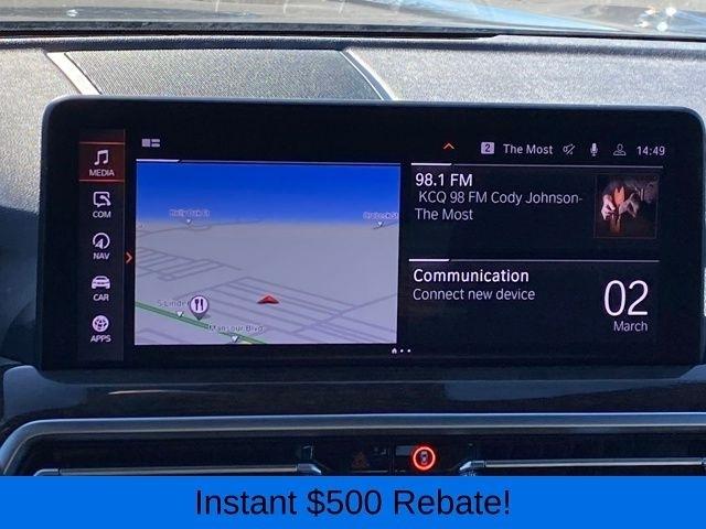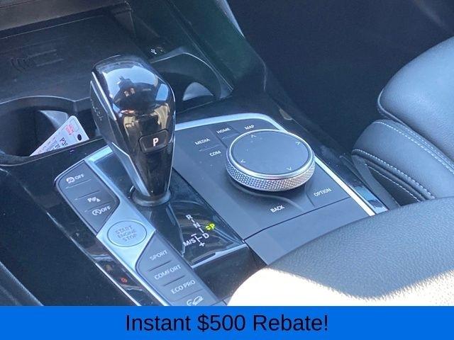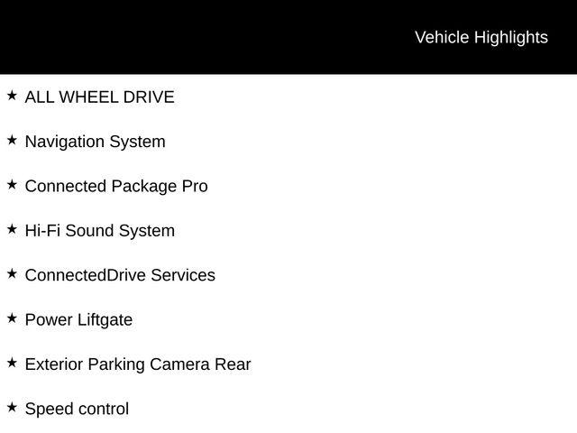 Apple CarPlay & Android Auto Compatibility, BMW Assist eCall, BMW TeleServices, Connected Package Pro, ConnectedDrive Services, Exterior Parking Camera Rear, Hi-Fi Sound System, Navigation System, Power Liftgate, Speed control, Wheels: 19" x 7.5" Y-Spoke (Style 693), 12 Speakers, 3.385 Axle Ratio, 4-Wheel Disc Brakes, ABS brakes, Air Conditioning, Alloy wheels, AM/FM Radio, AM/FM radio: SiriusXM, Auto High-beam Headlights, Auto-dimming door mirrors, Auto-dimming Rear-View mirror, Automatic temperature control, Brake assist, Bumpers: body-color, Delay-off headlights, Driver door bin, Driver vanity mirror, Dual front impact airbags, Dual front side impact airbags, Electronic Stability Control, Emergency communication system: BMW Assist eCall, Enhanced USB & Bluetooth w/Smartphone Integration, Four wheel independent suspension, Front anti-roll bar, Front Bucket Seats, Front Center Armrest, Front dual zone A/C, Front reading lights, Fully automatic headlights, Garage door transmitter, Genuine wood dashboard insert, Genuine wood door panel insert, Heated door mirrors, Illuminated entry, Knee airbag, Leather steering wheel, Low tire pressure warning, Memory seat, Navigation, Occupant sensing airbag, Outside temperature display, Overhead airbag, Panic alarm, Passenger door bin, Passenger vanity mirror, Perforated SensaTec Upholstery, Power door mirrors, Power driver seat, Power Front Seats, Power passenger seat, Power steering, Power windows, Radio data system, Rain sensing wipers, Rear air conditioning, Rear anti-roll bar, Rear reading lights, Rear seat center armrest, Rear window defroster, Rear window wiper, Remote keyless entry, Security system, SiriusXM w/360L & 1 Yr Platinum Plan Subscription, Speed-sensing steering, Speed-Sensitive Wipers, Split folding rear seat, Spoiler, Sport Seats, Sport steering wheel, Steering wheel mounted audio controls, Tachometer, Telescoping steering wheel, Tilt steering wheel, Traction control, Trip computer, Turn signal indicator mirrors, Variably intermittent wipers, WiFi Hotspot, ALL WHEEL DRIVE, Apple CarPlay & Android Auto Compatibility, BMW Assist eCall, BMW TeleServices, Connected Package Pro, ConnectedDrive Services, Exterior Parking Camera Rear, Hi-Fi Sound System, Navigation System, Power Liftgate, Speed control, Wheels: 19" x 7.5" Y-Spoke (Style 693).