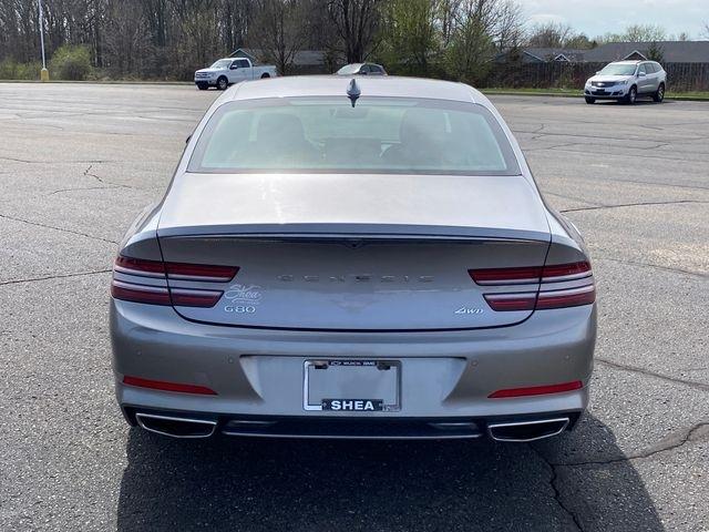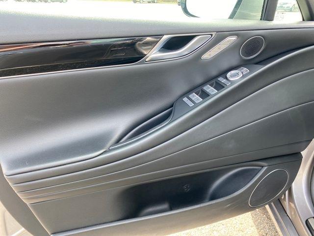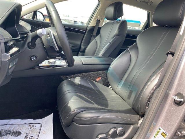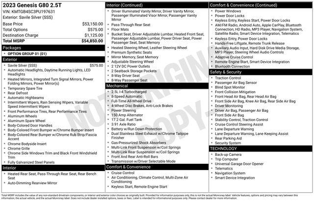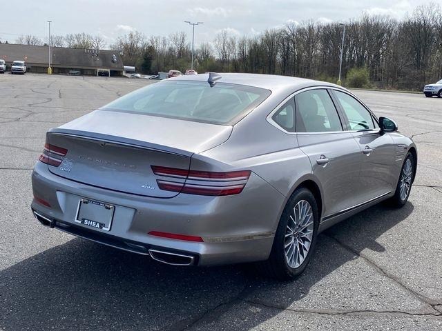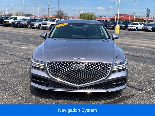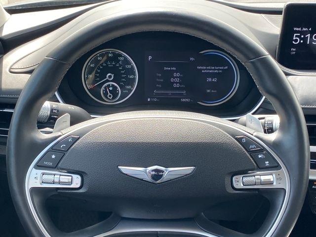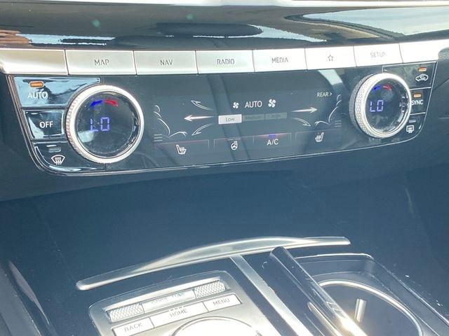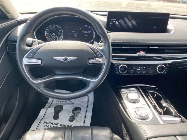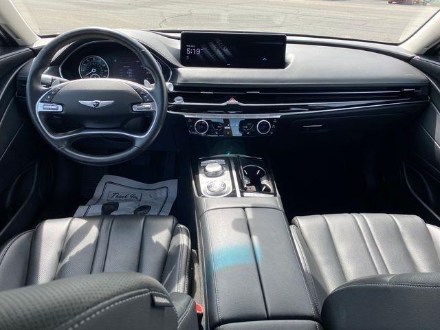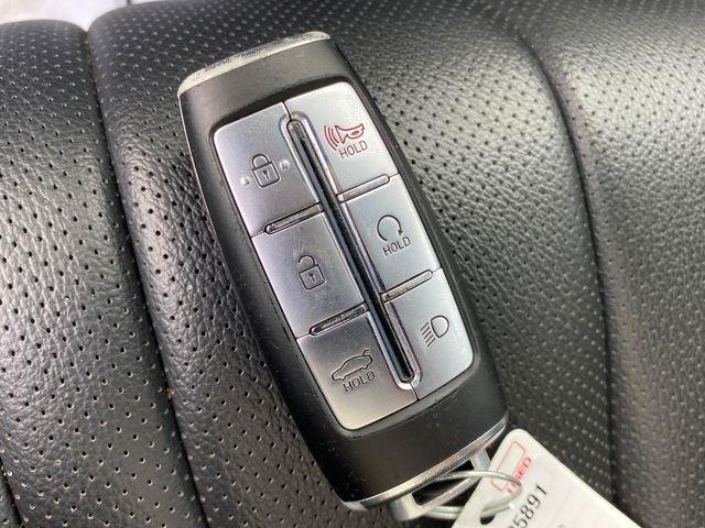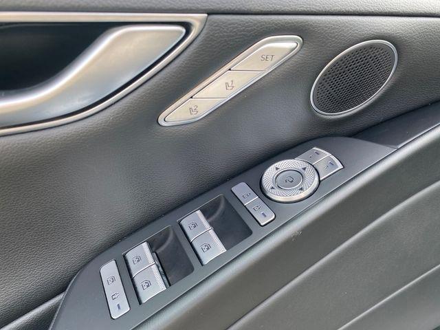 Navigation System, 12 Speakers, 4-Wheel Disc Brakes, ABS brakes, Air Conditioning, Alloy wheels, AM/FM radio: SiriusXM, Android Auto & Apple CarPlay, Anti-whiplash front head restraints, Auto High-beam Headlights, Auto tilt-away steering wheel, Auto-dimming door mirrors, Auto-dimming Rear-View mirror, Automatic temperature control, Bumpers: body-color, Compass, Delay-off headlights, Driver door bin, Driver vanity mirror, Dual front impact airbags, Dual front side impact airbags, Electronic Stability Control, Emergency communication system: Genesis Connected Services, Exterior Parking Camera Rear, Four wheel independent suspension, Front anti-roll bar, Front Bucket Seats, Front Center Armrest, Front dual zone A/C, Front reading lights, Fully automatic headlights, Garage door transmitter: HomeLink, Heated door mirrors, Heated Front Bucket Seats, Heated front seats, Heated rear seats, Heated steering wheel, Illuminated entry, Knee airbag, Leather steering wheel, Leatherette Seating Surfaces, Low tire pressure warning, Memory seat, Occupant sensing airbag, Option Group 01, Outside temperature display, Overhead airbag, Overhead console, Panic alarm, Passenger door bin, Passenger vanity mirror, Power door mirrors, Power driver seat, Power passenger seat, Power steering, Power windows, Radio data system, Radio: AM/FM/HD/SiriusXM Audio System, Rain sensing wipers, Rear anti-roll bar, Rear reading lights, Rear seat center armrest, Rear side impact airbag, Rear window defroster, Remote keyless entry, Security system, Speed control, Speed-sensing steering, Speed-Sensitive Wipers, Steering wheel memory, Steering wheel mounted audio controls, Tachometer, Telescoping steering wheel, Tilt steering wheel, Traction control, Trip computer, Turn signal indicator mirrors, Variably intermittent wipers, Wheels: 18"x8.0J Alloy, Navigation System.