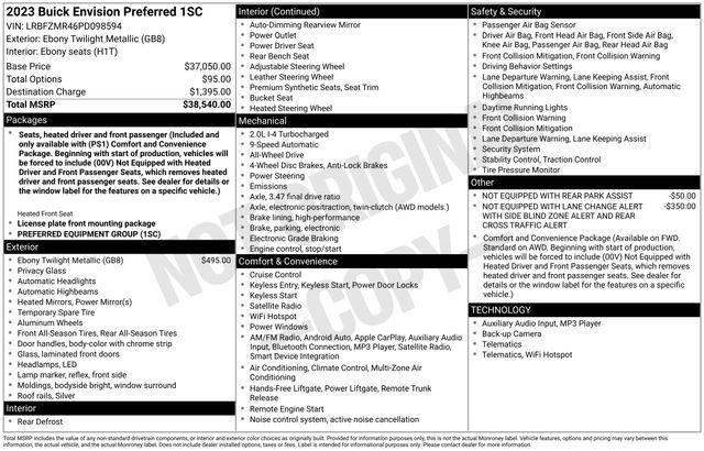 3.47 Final Drive Axle Ratio, 4-Wheel Disc Brakes, 6-Speaker Audio System Feature, 7 Speakers, 7-Speaker Audio System Feature w/Amplifier, 8-Way Power Driver Seat Adjuster, ABS brakes, Air Conditioning, Alloy wheels, AM/FM radio: SiriusXM, Apple CarPlay/Android Auto, Auto High-beam Headlights, Auto-dimming door mirrors, Auto-dimming Rear-View mirror, Automatic Emergency Braking, Automatic temperature control, Brake assist, Bumpers: body-color, Cloth w/Leatherette Seat Trim, Compass, Delay-off headlights, Driver door bin, Driver vanity mirror, Dual front impact airbags, Dual front side impact airbags, Electronic Stability Control, Emergency communication system: OnStar and Buick connected services capable, Following Distance Indicator, Forward Collision Alert, Four wheel independent suspension, Front anti-roll bar, Front Bin Center Console USB Ports, Front Bucket Seats, Front Center Armrest, Front dual zone A/C, Front Passenger 6-Way Manual Seat Adjuster, Front Pedestrian Braking, Front reading lights, Fully automatic headlights, Heated door mirrors, Heated front seats, Heated steering wheel, Illuminated entry, IntelliBeam Headlamp Control w/Auto High Beam, Knee airbag, Lane Keep Assist w/Lane Departure Warning, Low tire pressure warning, Not Equipped w/Lane Change & Rear Cross Traffic Alerts, Not Equipped w/Rear Park Assist, Occupant sensing airbag, Outside temperature display, Overhead airbag, Overhead console, Panic alarm, Passenger door bin, Passenger vanity mirror, Power door mirrors, Power driver seat, Power Liftgate, Power steering, Power windows, Preferred Equipment Group 1SC, Premium audio system: Buick Infotainment System, Radio data system, Radio: Buick Infotainment System AM/FM Stereo, Rear anti-roll bar, Rear reading lights, Rear seat center armrest, Rear window defroster, Rear window wiper, Remote keyless entry, Security system, SiriusXM Radio, Speed control, Split folding rear seat, Spoiler, Steering wheel mounted audio controls, Telescoping steering wheel, Tilt steering wheel, Traction control, Trip computer, USB Charging-Only Ports, Variably intermittent wipers, Wheels: 18" Aluminum w/Light Charcoal Met Finish, Wireless Apple CarPlay/Wireless Android Auto.