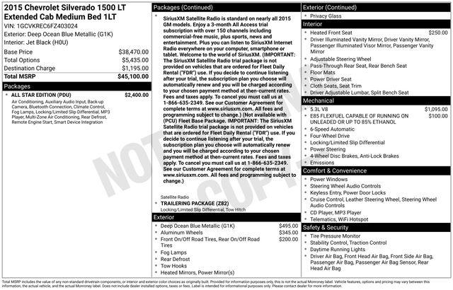 10-Way Power Driver's Seat Adjuster, 110-Volt AC Power Outlet, 150 Amp Alternator, 3.42 Rear Axle Ratio, 4 Movable Upper Cargo Tie Downs, 4-Wheel Disc Brakes, 4.2" Diagonal Color Display Driver Info Center, 40/20/40 Front Split Bench Seat, 6 Speaker Audio System, 6 Speakers, ABS brakes, Air Conditioning, All Star Edition, Alloy wheels, AM/FM radio: SiriusXM, Auxiliary External Transmission Oil Cooler, Bluetooth® For Phone, Body Color Bodyside Moldings, Body Color Door Handles, Body-Color Mirror Caps, Body-Color Power Adjustable Heated Outside Mirrors, Bodyside moldings, Brake assist, Bumpers: chrome, CD player, Cloth Seat Trim, Color-Keyed Carpeting w/Rubberized Vinyl Floor Mats, Compass, Deep-Tinted Glass, Delay-off headlights, Driver & Front Passenger Illuminated Vanity Mirrors, Driver door bin, Driver vanity mirror, Dual front impact airbags, Dual front side impact airbags, Dual-Zone Automatic Climate Control, E85 FlexFuel Capable, Electric Rear-Window Defogger, Electronic Stability Control, Emergency communication system: OnStar Directions & Connections, EZ Lift & Lower Tailgate, Front anti-roll bar, Front Center Armrest w/Storage, Front Chrome Bumper, Front Halogen Fog Lamps, Front reading lights, Front wheel independent suspension, Fully automatic headlights, Heated door mirrors, Heated Driver & Front Passenger Seats, Heavy-Duty Rear Locking Differential, Illuminated entry, Integrated Trailer Brake Controller, Leather Wrapped Steering Wheel w/Cruise Controls, LED Cargo Box Lighting, Low tire pressure warning, Manual Tilt Wheel Steering Column, Occupant sensing airbag, OnStar 6 Months Directions & Connections Plan, OnStar w/4G LTE, Outside temperature display, Overhead airbag, Overhead console, Panic alarm, Passenger door bin, Passenger vanity mirror, Polished Exhaust Tip, Power door mirrors, Power steering, Power windows, Power Windows w/Driver Express Up, Premium audio system: Chevrolet MyLink, Radio data system, Radio: AM/FM 8" Diagonal Color Touch Screen, Radio: AM/FM Audio System w/Chevrolet MyLink, Rear 60/40 Folding Bench Seat (Folds Up), Rear Chrome Bumper, Rear reading lights, Rear step bumper, Rear Vision Camera w/Dynamic Guide Lines, Rear Wheelhouse Liners, Remote Keyless Entry, Remote keyless entry, Remote Vehicle Starter System, Single Slot CD/MP3 Player, SiriusXM Satellite Radio, Speed control, Speed-sensing steering, Split folding rear seat, Steering Wheel Audio Controls, Steering wheel mounted audio controls, Tachometer, Theft Deterrent System (Unauthorized Entry), Tilt steering wheel, Traction control, Trailering Equipment, Trip computer, Variably intermittent wipers, Voltmeter, Wheels: 17" x 8" Bright Machined Aluminum.