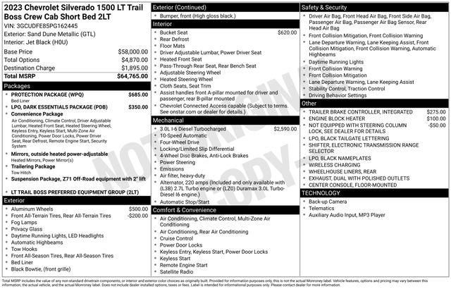 10-Way Power Driver Seat w/Lumbar, 12.3" Multicolor Reconfigurable Digital Display, 120-Volt Instrument Panel Power Outlet, 6-Speaker Audio System, All-Weather Floor Liner (LPO) (AAK), Auto-Locking Rear Differential, Bluetooth® For Phone, Color-Keyed Carpeting Floor Covering, Compass, Convenience Package, Deep-Tinted Glass, Dual Rear USB Ports (Charge Only), Dual-Zone Automatic Climate Control, Electric Rear-Window Defogger, Electrical Steering Column Lock, Electronic Cruise Control, EZ Lift Power Lock & Release Tailgate, Front LED Fog Lamps, HD Rear Vision Camera, Heated Driver & Front Outboard Passenger Seats, Heated Power-Adjustable Outside Mirrors, Heated Steering Wheel, High Gloss Black Mirror Caps, Inside Rear-View Mirror w/Tilt, Keyless Open & Start, LED Cargo Area Lighting, OnStar & Chevrolet Connected Services Capable, Performance Red Recovery Hooks, Power Front Windows w/Driver Express Up/Down, Power Front Windows w/Passenger Express Down, Power Rear Windows w/Express Down, Preferred Equipment Group 2LT, Rear 60/40 Folding Bench Seat (Folds Up), Remote Vehicle Starter System, SiriusXM w/360L, Standard Tailgate, Steering Wheel Audio Controls, Theft Deterrent System (Unauthorized Entry), Trailering Package, Wireless Phone Projection, Wrapped Steering Wheel, 120-Volt Bed Mounted Power Outlet, 2 USB Data Ports, 220 Amp Alternator, 4-Wheel Disc Brakes, 40/20/40 Front Split-Bench Seat, 6 Speakers, ABS brakes, Air Conditioning, Alloy wheels, AM/FM radio: SiriusXM with 360L, Apple CarPlay/Android Auto, Auto High-beam Headlights, Automatic Emergency Braking, Automatic temperature control, Black Name Plates (LPO), Black Tailgate CHEVROLET Lettering (LPO), Brake assist, Chevrolet Connected Access Capable, Chevytec Spray-On Black Bedliner, Cloth Seat Trim, Dark Essentials Package (LPO), Delay-off headlights, Driver door bin, Driver vanity mirror, Dual Exhaust w/Polished Outlets, Dual front impact airbags, Dual front side impact airbags, Electronic Stability Control, Electronic Transmission Range Selector Shifter, Engine Block Heater, Floor Mounted Center Console, Following Distance Indicator, Forward Collision Alert, Front anti-roll bar, Front Bucket Seats, Front Center Armrest w/Storage, Front dual zone A/C, Front fog lights, Front Pedestrian Braking, Front reading lights, Front wheel independent suspension, Fully automatic headlights, Heated door mirrors, Heated front seats, Heated steering wheel, Heavy-Duty Air Filter, Hill Descent Control, Hitch Guidance, Illuminated entry, Integrated Trailer Brake Controller, IntelliBeam Automatic High Beam On/Off, Lane Keep Assist w/Lane Departure Warning, Low tire pressure warning, Not Equipped w/Steering Column Lock, Occupant sensing airbag, Outside temperature display, Overhead airbag, Overhead console, Panic alarm, Passenger door bin, Passenger vanity mirror, Power door mirrors, Power driver seat, Power steering, Power windows, Premium audio system: Chevrolet Infotainment 3 Premium, Protection Package, Radio data system, Radio: Chevrolet Infotainment 3 Premium System, Rear reading lights, Rear step bumper, Rear Wheelhouse Liners, Rear window defroster, Remote keyless entry, Security system, Speed control, Speed-sensing steering, Split folding rear seat, Steering