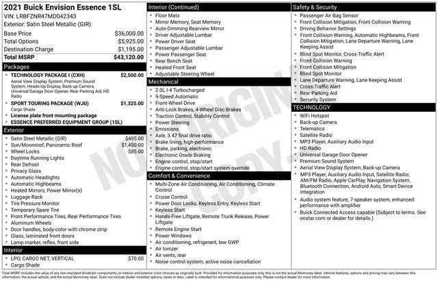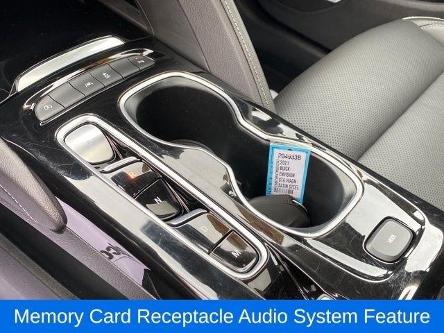 3-Channel Programmable Universal Home Remote, Black Roof Rack Cross Rails, Body-Color Door Handles, Front & Rear Park Assist, HD Radio, HD Surround Vision, Head-Up Display, Lower Trim/Wheel Arch Moldings, Memory Card Receptacle Audio System Feature, Radio: Buick Infotainment System AM/FM w/Nav, Rear Cargo Compartment Cover, Sport Touring Package, Technology Package I, Wheels: 20" Aluminum w/Dark Finish, 18" Machined Aluminum Wheels, 3.47 Final Drive Axle Ratio, 4-Wheel Disc Brakes, 7 Speakers, 7-Speaker Audio System Feature w/Amplifier, 8-Way Power Driver Seat Adjuster, ABS brakes, Air Conditioning, Alloy wheels, AM/FM radio: SiriusXM, Apple CarPlay/Android Auto, Auto High-beam Headlights, Auto-dimming door mirrors, Auto-dimming Rear-View mirror, Automatic temperature control, Brake assist, Bumpers: body-color, Compass, Delay-off headlights, Driver 4-Way Power Lumbar Seat Adjuster, Driver door bin, Driver vanity mirror, Dual front impact airbags, Dual front side impact airbags, Electronic Stability Control, Emergency communication system: OnStar and Buick connected services capable, Four wheel independent suspension, Front anti-roll bar, Front Bucket Seats, Front Center Armrest, Front dual zone A/C, Front Passenger 4-Way Power Lumbar Seat Adjuster, Front Passenger 8-Way Power Seat Adjuster, Front reading lights, Fully automatic headlights, Heated door mirrors, Heated Driver & Front Passenger Seats, Heated front seats, Heated steering wheel, Illuminated entry, Knee airbag, Leather Shift Knob, Low tire pressure warning, Memory seat, Occupant sensing airbag, Outside temperature display, Overhead airbag, Overhead console, Panic alarm, Passenger door bin, Passenger vanity mirror, Perforated Leather-Appointed Seat Trim, Power door mirrors, Power driver seat, Power Liftgate, Power Panoramic Tilt-Sliding Moonroof, Power passenger seat, Power steering, Power windows, Preferred Equipment Group 1SL, Radio data system, Radio: Buick Infotainment System AM/FM Stereo, Rear anti-roll bar, Rear reading lights, Rear seat center armrest, Rear window defroster, Rear window wiper, Remote keyless entry, Roof rack: rails only, Security system, SiriusXM Radio, Speed control, Speed-sensing steering, Split folding rear seat, Spoiler, Steering wheel mounted audio controls, Tachometer, Telescoping steering wheel, Tilt steering wheel, Traction control, Trip computer, USB Charging-Only Ports, USB Ports, Variably intermittent wipers, Vertical Cargo Net (LPO), Wheel Locks, Wireless Apple CarPlay/Wireless Android Auto, 3-Channel Programmable Universal Home Remote, Black Roof Rack Cross Rails, Body-Color Door Handles, Front & Rear Park Assist, HD Radio, HD Surround Vision, Head-Up Display, Lower Trim/Wheel Arch Moldings, Memory Card Receptacle Audio System Feature, Radio: Buick Infotainment System AM/FM w/Nav, Rear Cargo Compartment Cover, Sport Touring Package, Technology Package I, Wheels: 20" Aluminum w/Dark Finish.