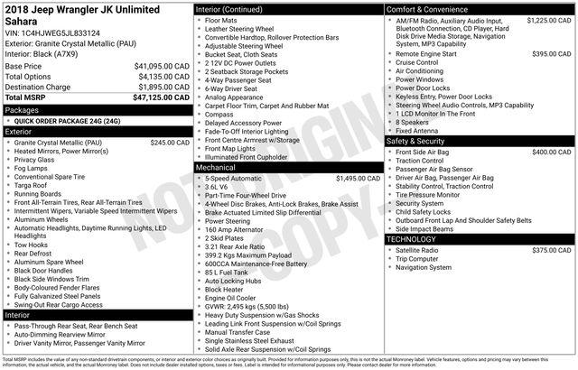 GPS Navigation, 18" x 7.5" Polished Satin Carbon Wheels, 3.21 Rear Axle Ratio, 4-Wheel Disc Brakes, 40GB Hard Drive w/28GB Available, 5-Year SiriusXM Travel Link Service, 6.5" Touchscreen Display, 8 Speakers, ABS brakes, Air Conditioning, Alloy wheels, AM/FM radio: SiriusXM, Audio Jack Input for Mobile Devices, Auto-dimming Rear-View mirror, Body Color Appliques Front Bumper, Body Color Appliques Rear Bumper, Body Color/Accent Color Grille, Brake assist, CD player, Cloth Seats w/Adjustable Head Restraints, Compass, Driver door bin, Driver Height Adjuster Seat, Driver vanity mirror, Dual front impact airbags, Electronic Stability Control, Front anti-roll bar, Front Bucket Seats, Front Center Armrest w/Storage, Front fog lights, Front reading lights, Front Seat Back Map Pockets, Fully automatic headlights, Heated door mirrors, Heavy Duty Suspension w/Gas Shocks, Illuminated entry, Integrated roll-over protection, Leather steering wheel, Low tire pressure warning, Occupant sensing airbag, Outside temperature display, Panic alarm, Passenger door bin, Passenger vanity mirror, Power door mirrors, Power steering, Power windows, Quick Order Package 24G, R1234YF A/C Refrigerant, Radio data system, Radio: 130, Radio: 430 Nav, Rear anti-roll bar, Remote keyless entry, Remote Start System, Remote USB Port, Security system, SiriusXM Travel Link, Speed control, Split folding rear seat, Steering wheel mounted audio controls, Sunrider Soft Top, Supplemental Front Seat Side Airbags, Tachometer, Tilt steering wheel, Traction control, Trip computer, Variably intermittent wipers, GPS Navigation.