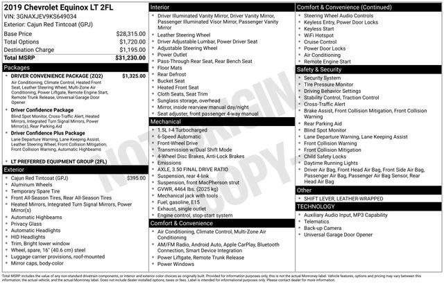 3-Spoke Leather-Wrapped Steering Wheel, Driver Confidence Package, Driver Confidence Plus Package, Driver Convenience Package, Dual Zone Automatic Climate Control, Following Distance Indicator, Forward Collision Alert, Front Pedestrian Braking, Heated Driver & Front Passenger Seats, IntelliBeam Auto High Beam Headlamp Control, Lane Change Alert w/Side Blind Zone Alert, Lane Keep Assist w/Lane Departure Warning, Leather-Wrapped Shift Lever, Low Speed Forward Automatic Braking, Outside Heated Power-Adjustable Mirrors, Rear Cross Traffic Alert, Rear Park Assist w/Audible Warning, Rear Power Liftgate, Remote Vehicle Starter System, Universal Home Remote, 17" Aluminum Wheels, 2 Rear USB Charging-Only Ports, 2 USB Ports & Auxiliary Input Jack, 2-Way Power Driver Lumbar Control Seat Adjuster, 3.50 Final Drive Axle Ratio, 4-Wheel Disc Brakes, 6 Speaker Audio System Feature, 6 Speakers, 8-Way Power Driver Seat Adjuster, ABS brakes, Air Conditioning, Alloy wheels, AM/FM radio: SiriusXM, Apple CarPlay/Android Auto, Auto High-beam Headlights, Bluetooth® For Phone, Brake assist, Bumpers: body-color, Compass, Delay-off headlights, Driver door bin, Driver vanity mirror, Dual front impact airbags, Dual front side impact airbags, Electronic Stability Control, Emergency communication system: OnStar and Chevrolet connected services capable, Four wheel independent suspension, Front anti-roll bar, Front Bucket Seats, Front Center Armrest, Front Passenger 4-Way Manual Seat Adjuster, Front reading lights, Fully automatic headlights, Heated door mirrors, High-Intensity Discharge Headlights, Illuminated entry, Low tire pressure warning, Occupant sensing airbag, Outside temperature display, Overhead airbag, Overhead console, Panic alarm, Passenger door bin, Passenger vanity mirror, Power door mirrors, Power driver seat, Power steering, Power windows, Preferred Equipment Group 2FL, Premium audio system: Chevrolet MyLink, Premium Cloth Seat Trim, Radio data system, Radio: Chevrolet Infotainment 3 System w/AM/FM, Rear anti-roll bar, Rear reading lights, Rear seat center armrest, Rear window defroster, Rear window wiper, Remote keyless entry, Security system, SiriusXM Radio, Speed control, Speed-sensing steering, Split folding rear seat, Spoiler, Steering wheel mounted audio controls, Tachometer, Telescoping steering wheel, Tilt steering wheel, Traction control, Trip computer, Turn signal indicator mirrors, Variably intermittent wipers, 3-Spoke Leather-Wrapped Steering Wheel, Driver Confidence Package, Driver Confidence Plus Package, Driver Convenience Package, Dual Zone Automatic Climate Control, Following Distance Indicator, Forward Collision Alert, Front Pedestrian Braking, Heated Driver & Front Passenger Seats, IntelliBeam Auto High Beam Headlamp Control, Lane Change Alert w/Side Blind Zone Alert, Lane Keep Assist w/Lane Departure Warning, Leather-Wrapped Shift Lever, Low Speed Forward Automatic Braking, Outside Heated Power-Adjustable Mirrors, Rear Cross Traffic Alert, Rear Park Assist w/Audible Warning, Rear Power Liftgate, Remote Vehicle Starter System, Universal Home Remote.