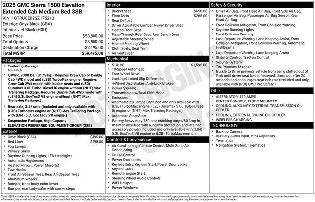 10-Way Power Driver Seat Adjuster w/Lumbar, 120-Volt Bed Mounted Power Outlet, 120-Volt Interior Power Outlet, 170 Amp Alternator, 2 Charge/Data USB Ports, 2 Charge/Data USB Ports Inside Center Console, 2 Type-C Charge-Only Rear USB Ports, 220 Amp Alternator, 4-Way Manual Passenger Seat Adjuster, 4-Wheel Disc Brakes, 6 Speakers, 6-Speaker Audio System Feature, ABS brakes, Air Conditioning, All-Weather Floor Liner (LPO), Alloy wheels, AM/FM radio: SiriusXM with 360L, Apple CarPlay/Android Auto, Auto High-beam Headlights, Auto-Locking Rear Differential, Automatic Emergency Braking, Automatic temperature control, Auxiliary External Transmission Oil Cooler, Body Color Header w/Gloss Black Mesh Grille Bars, Brake assist, Buckle to Drive, Bumpers: body-color, Cloth Seat Trim, Color-Keyed Carpeting Floor Covering, Compass, Deep-Tinted Glass, Delay-off headlights, Driver door bin, Driver vanity mirror, Drop-In Bed Liner w/Tailgate Liner (LPO), Dual front impact airbags, Dual front side impact airbags, Electric Rear-Window Defogger, Electronic Precision Shift, Electronic Stability Control, Emergency communication system: OnStar, External Engine Oil Cooling, Floor-Mounted Center Console, Following Distance Indicator, Forward Collision Alert, Front 40/20/40 Split-Bench Seat, Front anti-roll bar, Front Bucket Seats, Front Center Armrest w/Storage, Front dual zone A/C, Front fog lights, Front Frame-Mounted Black Recovery Hooks, Front Pedestrian Braking, Front reading lights, Front Rubberized-Vinyl Floor Mats, Front wheel independent suspension, Fully automatic headlights, Genuine wood dashboard insert, HD Rear Vision Camera, Heated door mirrors, Heated Driver & Front Outboard Passenger Seating, Heated front seats, Heated steering wheel, High Capacity Suspension Package, Hitch Guidance, Illuminated entry, Integrated Trailer Brake Controller, IntelliBeam Automatic High Beam On/Off, Keyless Open & Start, Lane Keep Assist w/Lane Departure Warning, LED Cargo Area Lighting, Low tire pressure warning, Manual Tilt-Wheel & Telescoping Steering Column, Navigation System, Occupant sensing airbag, OnStar Services Capable, Outside temperature display, Overhead airbag, Overhead console, Panic alarm, Passenger door bin, Passenger vanity mirror, Power Door Locks, Power door mirrors, Power driver seat, Power Front Windows w/Driver Express Up/Down, Power Front Windows w/Passenger Express Down, Power Rear Windows w/Express Down, Power steering, Power windows, Preferred Equipment Group 3SB, Push Button Start, Radio data system, Radio: Premium GMC Infotainment Audio System, Rear reading lights, Rear Rubberized-Vinyl Floor Mats, Rear step bumper, Rear window defroster, Remote keyless entry, Remote Vehicle Starter System, Security system, SiriusXM w/360L Trial Subscription, Speed control, Speed-sensing steering, Split folding rear seat, Steering Wheel Audio Controls, Steering wheel mounted audio controls, Tachometer, Telescoping steering wheel, Theft Deterrent System (Unauthorized Entry), Tilt steering wheel, Traction control, Trailering Package, Trip computer, Variably intermittent wipers, Voltmeter, Wheels: 20" x 9" High Gloss Black Painted Aluminum, Wi-Fi Hotspot Capable, Wireless Apple CarPlay/Wireless Android Auto, Wireless Charging.