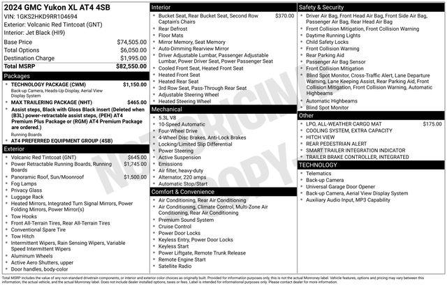 15" Diagonal Multi-Color Head-Up Display, Extra Capacity Cooling System, HD Surround Vision, Max Trailering Package, Navigation System, Rear Pedestrian Alert, Technology Package, 12-Way Power Seat Adjusters, 2 Presets For Outside Rearview Mirrors, 3.23 Rear Axle Ratio, 3rd Row 60/40 Power-Folding Split-Bench Seat, 3rd row seats: split-bench, 4-Wheel Disc Brakes, 9 Speakers, ABS brakes, Adaptive suspension, Air Conditioning, All-Weather Cargo Mat (LPO), Alloy wheels, AM/FM radio: SiriusXM with 360L, AM/FM Stereo, Apple CarPlay/Android Auto, Auto High-beam Headlights, Auto-dimming door mirrors, Auto-dimming Rear-View mirror, Auto-leveling suspension, Automatic Emergency Braking, Automatic temperature control, Black Roof-Mounted Luggage Rack Side Rails, Bose 9-Speaker Stereo Audio System Feature, Brake assist, Bright Front & Rear Door Sill Plates, Bumpers: body-color, Compass, Delay-off headlights, Driver door bin, Driver vanity mirror, Dual front impact airbags, Dual front side impact airbags, Dual-Pane Panoramic Power Sunroof, Electronic Stability Control, Emergency communication system: OnStar and GMC connected services capable, Following Distance Indicator, Forward Collision Alert, Four wheel independent suspension, Front & Rear Park Assist, Front anti-roll bar, Front Bucket Seats, Front Center Armrest, Front dual zone A/C, Front fog lights, Front High-Approach Angle Fascia, Front Pedestrian Braking, Front reading lights, Fully automatic headlights, Garage door transmitter, Hands-Free Power Programmable Rear Liftgate, Heated 2nd Row Outboard Position Seats, Heated door mirrors, Heated Driver & Front Passenger Seats, Heated front seats, Heated rear seats, Heated Steering Wheel, Heated steering wheel, Heavy-Duty Air Filter, Hill Descent Control, Hitch View, Illuminated entry, Inside Rear-View Auto-Dimming Mirror, Integrated Trailer Brake Controller, IntelliBeam Automatic High Beam On/Off, Lane Change Alert w/Side Blind Zone Alert, Lane Keep Assist w/Lane Departure Warning, Low tire pressure warning, Magnetic Ride Control Suspension, Memory seat, Occupant sensing airbag, Outside Heated Power-Adjustable Mirrors, Outside temperature display, Overhead airbag, Overhead console, Panic alarm, Passenger door bin, Passenger vanity mirror, Perforated Heated & Ventilated Dr & Frt Pass Seats, Perforated Leather Seating Surfaces, Power door mirrors, Power driver seat, Power Liftgate, Power passenger seat, Power Release 2nd Row 60/40 Split-Folding Bench Seat, Power Release 2nd Row Bucket Seats, Power steering, Power Tilt & Telescopic Steering Column, Power windows, Power-Retractable Assist Steps, Preferred Equipment Group 4SB, Rain sensing wipers, Rear air conditioning, Rear anti-roll bar, Rear Cross Traffic Alert, Rear reading lights, Rear seat center armrest, Rear window defroster, Rear window wiper, Red Horizontal-Mounted Recovery Hooks, Remote keyless entry, Roof rack: rails only, Safety Alert Seat, Security system, SiriusXM w/360L, Smart Trailer Integration Indicator, Speed control, Speed-sensing steering, Split folding rear seat, Spoiler, Steering wheel memory, Steering wheel mounted audio controls, Tachometer, Telescoping steering wheel, Tilt steering wheel, Traction control, Trailer Side Blind Zone Alert, Trip computer, Turn signal indicator mirrors, Universal Home Remote, Variably intermittent wipers, Ventilated front seats, Voltmeter, Wheels: 20" x 9" 6-Spoke Machined Aluminum, Wireless Charging, 15" Diagonal Multi-Color Head-Up Display, Extra Capacity Cooling System, HD Surround Vision, Max Trailering Package, Navigation System, Rear Pedestrian Alert, Technology Package.