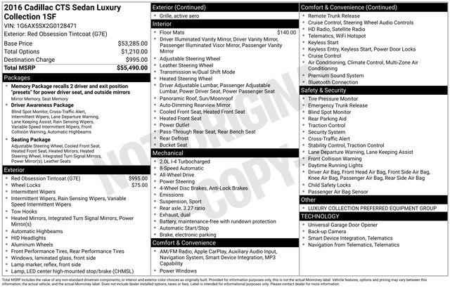 Bose Centerpoint Surround Sound 13-Speaker System, Driver Awareness Package, Forward Collision Alert, Heated Driver & Front Passenger Seats, Heated Steering Wheel Rim, Heated/Ventilated Driver & Front Passenger Seats, IntelliBeam Headlamps, Lane Change Alert, Lane Keep Assist w/Lane Departure Warning, LED Accent Lighting, Navigation System, Outside Heated Power-Adjustable Mirrors, Power Tilt & Telescoping Steering Column, Rainsense Wipers, Rear Cross Traffic Alert, Seating Package, Side Blind Zone Alert, 13 Speakers, 4-Wheel Disc Brakes, ABS brakes, Air Conditioning, Alloy wheels, AM/FM radio: SiriusXM, Anti-whiplash front head restraints, Apple CarPlay, Auto High-beam Headlights, Auto-dimming door mirrors, Auto-dimming Rear-View mirror, Automatic temperature control, Brake assist, Bumpers: body-color, Compass, Delay-off headlights, Driver door bin, Driver vanity mirror, Dual front impact airbags, Dual front side impact airbags, Electronic Stability Control, Emergency communication system: OnStar Guidance, Exterior Parking Camera Rear, Four wheel independent suspension, Front anti-roll bar, Front Bucket Seats, Front Center Armrest w/Storage, Front dual zone A/C, Front reading lights, Fully automatic headlights, Garage door transmitter, Genuine wood console insert, Genuine wood dashboard insert, Genuine wood door panel insert, Heated door mirrors, Heated front seats, Heated steering wheel, High-Intensity Discharge Headlamps, High-Intensity Discharge Headlights, Illuminated entry, Knee airbag, Lane Departure Warning System, Leather Seating Surfaces, Leather Shift Knob, Leather steering wheel, Low tire pressure warning, Memory seat, Occupant sensing airbag, Outside temperature display, Overhead airbag, Panic alarm, Passenger door bin, Passenger vanity mirror, Power door mirrors, Power driver seat, Power moonroof: UltraView, Power passenger seat, Power steering, Power windows, Preferred Equipment Group 1SF, Premium All-Weather Floor Mats, Premium audio system: Cadillac CUE, Radio data system, Radio: Cadillac CUE Info/Media Cont/Embedded Nav, Rain sensing wipers, Rear anti-roll bar, Rear reading lights, Rear seat center armrest, Rear side impact airbag, Rear window defroster, Remote keyless entry, Security system, SiriusXM Satellite & HD Radio, Speed control, Speed-sensing steering, Split folding rear seat, Split-Folding Rear Seat, Steering wheel mounted audio controls, Tachometer, Telescoping steering wheel, Tilt steering wheel, Traction control, Trip computer, Turn signal indicator mirrors, UltraView Power Sunroof, Variably intermittent wipers, Ventilated front seats, Voltmeter, Wheel Locks, Wheels: 17" x 8.5" 10-Spoke Ultra-Bright Machined, Bose Centerpoint Surround Sound 13-Speaker System, Driver Awareness Package, Forward Collision Alert, Heated Driver & Front Passenger Seats, Heated Steering Wheel Rim, Heated/Ventilated Driver & Front Passenger Seats, IntelliBeam Headlamps, Lane Change Alert, Lane Keep Assist w/Lane Departure Warning, LED Accent Lighting, Navigation System, Outside Heated Power-Adjustable Mirrors, Power Tilt & Telescoping Steering Column, Rainsense Wipers, Rear Cross Traffic Alert, Seating Package, Side Blind Zone Alert.