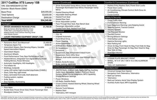 Automatic Parking Assist, Bose Premium 8-Speaker Audio System Feature, Driver Awareness Package, Dual-Outlet Stainless-Steel Exhaust, Forward Collision Alert, Lane Keep Assist w/Lane Departure Warning, Leather-Wrapped Steering Wheel, Luxury Package 1SB, Navigation System, Rear Cross-Traffic Alert, Side Blind Zone Alert, Surround Vision, Upper & Lower Auxiliary Daytime Running Lamps, 19" x 8.5" Aluminum Wheels, 4-Way Driver Power Lumbar Control Seat Adjuster, 4-Way Front Passenger Power Lumbar Control, 4-Wheel Disc Brakes, 8 Speakers, ABS brakes, Adaptive suspension, Air Conditioning, All-Weather Floor Mats, Alloy wheels, AM/FM radio: SiriusXM, Apple CarPlay/Android Auto, Auto tilt-away steering wheel, Auto-dimming door mirrors, Auto-dimming Rear-View mirror, Auto-leveling suspension, Automatic temperature control, Bodyside moldings, Brake assist, Bumpers: body-color, Compass, Delay-off headlights, Driver door bin, Driver vanity mirror, Dual front impact airbags, Dual front side impact airbags, Electronic Stability Control, Emergency communication system: OnStar Guidance, Exterior Parking Camera Rear, Four wheel independent suspension, Front & Rear Park Assist, Front anti-roll bar, Front Bucket Seats, Front Center Armrest w/Storage, Front dual zone A/C, Front License Plate Bracket, Front reading lights, Fully automatic headlights, Garage door transmitter, Genuine wood console insert, Genuine wood dashboard insert, Genuine wood door panel insert, Heated & Ventilated Front Bucket Seats, Heated door mirrors, Heated front seats, Heated rear seats, Heated steering wheel, High-Intensity Discharge Headlights, Illuminated entry, Knee airbag, Leather Seating Surfaces, Leather Shift Knob, Leather steering wheel, Low tire pressure warning, Memory seat, Occupant sensing airbag, Outside temperature display, Overhead airbag, Panic alarm, Passenger door bin, Passenger vanity mirror, Power door mirrors, Power driver seat, Power passenger seat, Power steering, Power windows, Radio data system, Radio: Cadillac CUE Info/Media Ctrl w/Embedded Nav, Rain sensing wipers, Rear anti-roll bar, Rear reading lights, Rear seat center armrest, Rear side impact airbag, Rear window defroster, Remote keyless entry, Road Emergency Tool Kit, Security system, SiriusXM Satellite Radio & HD Radio, Speed control, Speed-sensing steering, Split folding rear seat, Spoiler, Steering wheel memory, Steering wheel mounted audio controls, Tachometer, Telescoping steering wheel, Tilt steering wheel, Traction control, Trip computer, Turn signal indicator mirrors, UltraView Power Sunroof, Variably intermittent wipers, Ventilated front seats, Voltmeter, Automatic Parking Assist, Bose Premium 8-Speaker Audio System Feature, Driver Awareness Package, Dual-Outlet Stainless-Steel Exhaust, Forward Collision Alert, Lane Keep Assist w/Lane Departure Warning, Leather-Wrapped Steering Wheel, Luxury Package 1SB, Navigation System, Rear Cross-Traffic Alert, Side Blind Zone Alert, Surround Vision, Upper & Lower Auxiliary Daytime Running Lamps.