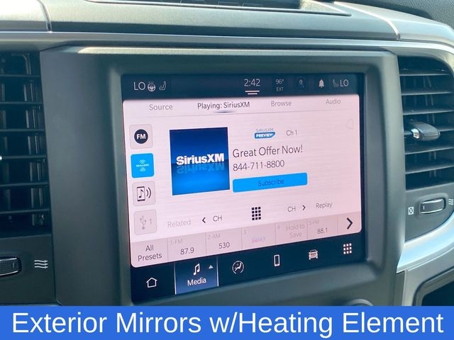 2nd Row In Floor Storage Bins, Auto-Dimming Exterior Mirrors, Auto-Dimming Rear-View Mirror, Black Exterior Mirrors, Cluster 7.0" TFT Color Display, Exterior Mirrors Courtesy Lamps, Exterior Mirrors w/Heating Element, Exterior Mirrors w/Supplemental Signals, Glove Box Lamp, Heated Front Seats, Heated Seats & Wheel Group, Heated Steering Wheel, Humidity Sensor, Leather Wrapped Steering Wheel, LED Bed Lighting, Luxury Group, Overhead Console w/Garage Door Opener, Power Heated Fold-Away Mirrors, Power-Folding Mirrors, Rear Dome w/On/Off Switch Lamp, Steering Wheel Mounted Audio Controls, Sun Visors w/Illuminated Vanity Mirrors, Universal Garage Door Opener, 3.21 Rear Axle Ratio, 4-Wheel Disc Brakes, 40/20/40 Split Bench Seat, 6 Speakers, 8.4" Touchscreen Display, ABS brakes, Active Grille Shutters, Air Conditioning, Air Conditioning ATC w/Dual Zone Control, Alloy wheels, AM/FM radio: SiriusXM, Audio Input Jack for Mobile Devices, Brake assist, Bumpers: chrome, Center Hub, Class IV Receiver Hitch, Cloth 40/20/40 Bench Seat, Compass, Delay-off headlights, Driver door bin, Dual front impact airbags, Dual front side impact airbags, Electronic Shift, Electronic Stability Control, Electronics Group, Engine Calibration Flash, V2, Front anti-roll bar, Front Armrest w/3 Cupholders, Front Center Armrest w/Storage, Front License Plate Bracket, Front reading lights, Front wheel independent suspension, Fully automatic headlights, Global Telematics Box Module (TBM), GPS Antenna Input, Heated door mirrors, Illuminated entry, Integrated Center Stack Radio, Integrated Voice Command w/Bluetooth, Low tire pressure warning, Media Hub (2 USB, AUX), Occupant sensing airbag, Outside temperature display, Overhead airbag, Overhead console, Panic alarm, ParkSense Rear Park Assist System, ParkView Rear Back-Up Camera, Passenger door bin, Passenger vanity mirror, Power door mirrors, Power steering, Power windows, Protection Group, Radio data system, Radio: Uconnect 3 w/5" Display, Radio: Uconnect 5 W w/8.4" Display, Rear anti-roll bar, Rear Power Sliding Window, Rear seat center armrest, Rear step bumper, Rear Window Defroster, Remote keyless entry, Remote Start & Security Alarm Group, Remote USB Port, Remote USB Port - Charge Only, Rotary Shifter-Black, Security Alarm, SiriusXM Guardian - Included Trial (B), Speed control, Storage Tray, Tachometer, Tilt steering wheel, Tip Start, Tow Hooks, Traction control, Tri-Fold Tonneau Cover, Trip computer, USB Host Flip, Variably intermittent wipers, Voltmeter, 2nd Row In Floor Storage Bins, Auto-Dimming Exterior Mirrors, Auto-Dimming Rear-View Mirror, Black Exterior Mirrors, Cluster 7.0" TFT Color Display, Exterior Mirrors Courtesy Lamps, Exterior Mirrors w/Heating Element, Exterior Mirrors w/Supplemental Signals, Glove Box Lamp, Heated Front Seats, Heated Seats & Wheel Group, Heated Steering Wheel, Humidity Sensor, Leather Wrapped Steering Wheel, LED Bed Lighting, Luxury Group, Overhead Console w/Garage Door Opener, Power Heated Fold-Away Mirrors, Power-Folding Mirrors, Rear Dome w/On/Off Switch Lamp, Steering Wheel Mounted Audio Controls, Sun Visors w/Illuminated Vanity Mirrors, Universal Garage Door Opener.