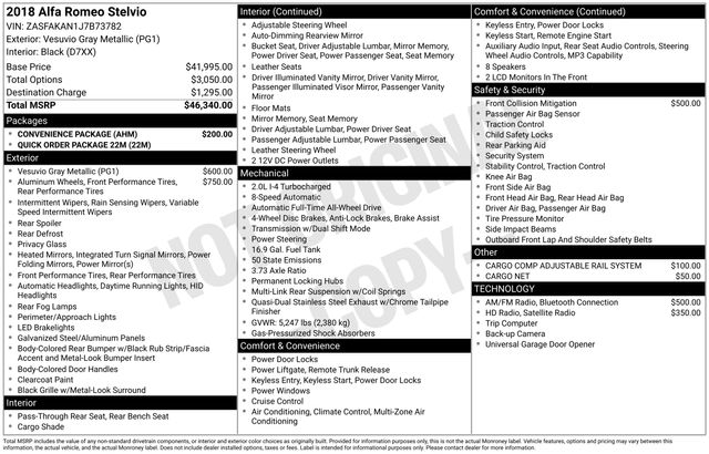 This 2018 Alfa Romeo Stelvio Base is an exceptional choice for the discerning driver. Boasting a sleek and stylish exterior, this all-wheel-drive SUV is equipped with a powerful I4 engine and an 8-speed automatic transmission, delivering an impressive blend of performance and efficiency with 22 city and 28 highway MPG.