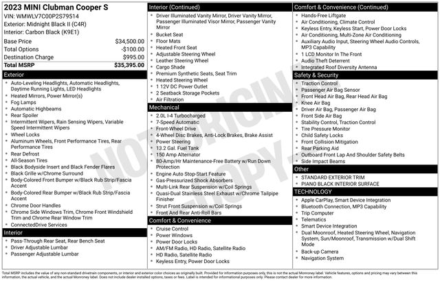 4-Wheel Disc Brakes, 6 Speakers, ABS brakes, Air Conditioning, Alloy wheels, AM/FM Radio, AM/FM radio: SiriusXM, Apple CarPlay Compatibility, Auto High-beam Headlights, Automatic temperature control, Brake assist, Bumpers: body-color, ConnectedDrive Services, Delay-off headlights, Driver door bin, Driver vanity mirror, Dual front impact airbags, Dual front side impact airbags, Electronic Stability Control, Emergency communication system: MINI Intelligent Emergency Call, Enhanced USB & Bluetooth, Exterior Parking Camera Rear, Four wheel independent suspension, Front anti-roll bar, Front Bucket Seats, Front Center Armrest, Front dual zone A/C, Front fog lights, Front reading lights, Front Sport Seats, Fully automatic headlights, Heated door mirrors, Heated Front Seats, Heated front seats, Heated steering wheel, Heated Steering Wheel Credit, Illuminated entry, Knee airbag, Leather steering wheel, Low tire pressure warning, Media Display (6UF), MINI Assist eCall, MINI Connected, MINI TeleServices, Occupant sensing airbag, Outside temperature display, Overhead airbag, Overhead console, Passenger door bin, Passenger Seat Height Adjustment, Passenger vanity mirror, Power door mirrors, Power steering, Power windows, Radio Control US, Radio data system, Rain sensing wipers, Rear anti-roll bar, Rear window defroster, Rear window wiper, Remote keyless entry, Remote Services, Sensatec Leatherette Upholstery, SiriusXM Satellite Radio, Speed control, Speed-sensing steering, Speed-Sensitive Wipers, Split folding rear seat, Spoiler, Sport steering wheel, Steering wheel mounted audio controls, Tachometer, Telescoping steering wheel, Tilt steering wheel, Traction control, Trip computer, Variably intermittent wipers, Wheels: 17" x 7.5" Vent Spoke Silver Alloy.
