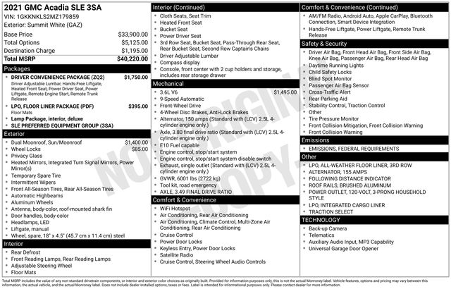 120-Volt Power Outlet, 8-Way Power Driver Seat Adjuster, Brushed Aluminum Roof Rails, Driver Convenience Package, Hands Free Power Programmable Liftgate, Heated Driver & Front Passenger Seats, Power Driver Lumbar Control Seat Adjuster, Remote Start, 155 Amp Alternator, 1st & 2nd Row All-Weather Floor Liner (LPO), 3rd Row All-Weather Floor Liner (LPO), 3rd row seats: split-bench, 4-Way Manual Driver Seat Adjuster, 4-Way Manual Passenger Seat Adjuster, 4-Wheel Disc Brakes, 6 Speakers, 6-Passenger (2-2-2 Seating Configuration), 6-Speaker Audio System Feature, ABS brakes, Air Conditioning, Alloy wheels, AM/FM radio: SiriusXM, Apple CarPlay/Android Auto, Automatic Emergency Braking, Automatic temperature control, Brake assist, Bright Wheel Locks (LPO), Bumpers: body-color, Compass, Delay-off headlights, Driver door bin, Driver vanity mirror, Dual front impact airbags, Dual front side impact airbags, Dual SkyScape 2-Panel Power Sunroof, Electronic Stability Control, Emergency communication system: OnStar and GMC connected services capable, Floor Liner Package (LPO), Following Distance Indicator, Forward Collision Alert, Four wheel independent suspension, Front & Rear Park Assist, Front anti-roll bar, Front Bucket Seats, Front Center Armrest, Front dual zone A/C, Front Pedestrian Braking, Front reading lights, Fully automatic headlights, Heated door mirrors, Illuminated entry, Integrated Cargo Liner (LPO), IntelliBeam Automatic High-Beam Headlamps, Knee airbag, Lane Keep Assist w/Lane Departure Warning, Low tire pressure warning, Occupant sensing airbag, Outside temperature display, Overhead airbag, Overhead console, Panic alarm, Passenger door bin, Passenger vanity mirror, Power door mirrors, Power steering, Power windows, Preferred Equipment Group 3SA, Premium audio system: GMC Infotainment System, Premium Cloth Seat Trim, Radio data system, Radio: AM/FM w/8" Diagonal Multi-Touch Display, Rear air conditioning, Rear anti-roll bar, Rear reading lights, Rear window defroster, Rear window wiper, Remote keyless entry, Security system, SiriusXM Radio, Speed control, Speed-sensing steering, Spoiler, Steering wheel mounted audio controls, Tachometer, Telescoping steering wheel, Tilt steering wheel, Traction control, Trip computer, Turn signal indicator mirrors, Universal Home Remote, Variably intermittent wipers, Voltmeter, Wheels: 18" Machined Aluminum w/Dark Accents, Wireless Apple CarPlay/Wireless Android Auto, 120-Volt Power Outlet, 8-Way Power Driver Seat Adjuster, Brushed Aluminum Roof Rails, Driver Convenience Package, Hands Free Power Programmable Liftgate, Heated Driver & Front Passenger Seats, Power Driver Lumbar Control Seat Adjuster, Remote Start.