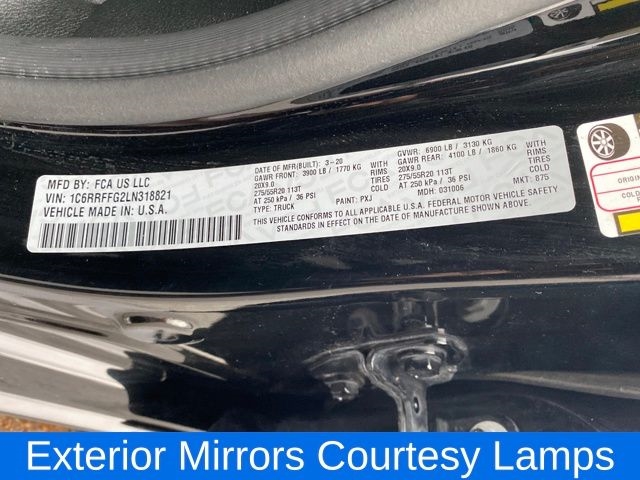 115V Auxiliary Power Outlet, 115V Auxiliary Rear Power Outlet, 2 USB Full Function/Charge Only Media Hub, 2nd Row In Floor Storage Bins, 400W Inverter, Air Conditioning ATC w/Dual Zone Control, Anti-Spin Differential Rear Axle, Auto-Dimming Exterior Driver Mirror, Auto-Dimming Rear-View Mirror, Big Horn IP Badge, Big Horn Level 2 Equipment Group, Black Exterior Truck Badging, Black Headlamp Bezels, Black Interior Accents, Black Premium Power Mirrors, Body Color Door Handles, Body Color Exterior Mirrors, Body Color Front Bumper, Body Color Premium Power Mirrors, Body Color Rear Bumper w/Step Pads, Class IV Receiver Hitch, Dampened Tailgate, Deluxe Cloth Bucket Seats, Dual Exhaust w/Black Tips, Exterior Mirrors Courtesy Lamps, Exterior Mirrors w/Memory, Foam Bottle Insert (Door Trim Panel), Glove Box Lamp, Grille Surround 1 Black Texture 2 Black, Heated Front Seats, Heated Steering Wheel, Night Edition, ParkSense Front/Rear Park Assist w/Stop, Power 4-Way Driver Lumbar Adjust, Power 8-Way Driver Seat, Power Adjustable Pedals, Power-Folding Mirrors, Radio: Uconnect 4 w/8.4" Display, Rear Dome w/On/Off Switch Lamp, Rear Power Sliding Window, Rear Window Defroster, Security Alarm, SiriusXM Satellite Radio, Sun Visors w/Illuminated Vanity Mirrors, Universal Garage Door Opener, Wheels: 20" x 9.0" Premium Paint/Polished, 3 Rear Seat Head Restraints, 4 Way Front Headrests, 4-Wheel Disc Brakes, 48V Belt Starter Generator, 6 Speakers, ABS brakes, Air Conditioning, Alloy wheels, AM/FM radio, Big Horn Badge, Brake assist, Bucket Seats, Bumpers: chrome, Cloth Bench Seat, Compass, Delay-off headlights, Driver door bin, Dual front impact airbags, Dual front side impact airbags, Electronic Stability Control, Front & Rear Rubber Floor Mats, Front anti-roll bar, Front Center Armrest w/Storage, Front fog lights, Front reading lights, Front Seat Back Map Pockets, Front wheel independent suspension, Full Length Floor Console, Fully automatic headlights, GPS Antenna Input, Heated door mirrors, Illuminated entry, Leather steering wheel, Low tire pressure warning, Manual Adjust 4-Way Front Passenger Seat, Manufacturer's Statement of Origin, Occupant sensing airbag, Outside temperature display, Overhead airbag, Overhead console, Panic alarm, ParkView Rear Back-Up Camera, Passenger door bin, Passenger vanity mirror, Power door mirrors, Power steering, Power windows, Quick Order Package 23Z Big Horn, Radio data system, Radio: Uconnect 3 w/5" Display, Rear 60/40 Folding Seat, Rear anti-roll bar, Rear seat center armrest, Rear step bumper, Remote keyless entry, Remote Start System, Speed control, Split folding rear seat, Steering wheel mounted audio controls, Tachometer, Telescoping steering wheel, Tilt steering wheel, Traction control, Trip computer, Variably intermittent wipers, Voltmeter, Wheels: 18" x 8" Cast-Aluminum Painted, 115V Auxiliary Power Outlet, 115V Auxiliary Rear Power Outlet, 2 USB Full Function/Charge Only Media Hub, 2nd Row In Floor Storage Bins, 400W Inverter, Air Conditioning ATC w/Dual Zone Control, Anti-Spin Differential Rear Axle, Auto-Dimming Exterior Driver Mirror, Auto-Dimming Rear-View Mirror, Big Horn IP Badge, Big Horn Level 2 Equipment Group, Black Exterior Truck Badging, Black Headlamp Bezels, Black Interior Accents, Black Premium Power Mirrors, Body Color Door Handles, Body Color Exterior Mirrors, Body Color Front Bumper, Body Color Premium Power Mirrors, Body Color Rear Bumper w/Step Pads, Class IV Receiver Hitch, Dampened Tailgate, Deluxe Cloth Bucket Seats, Dual Exhaust w/Black Tips, Exterior Mirrors Courtesy Lamps, Exterior Mirrors w/Memory, Foam Bottle Insert (Door Trim Panel), Glove Box Lamp, Grille Surround 1 Black Texture 2 Black, Heated Front Seats, Heated Steering Wheel, Night Edition, ParkSense Front/Rear Par