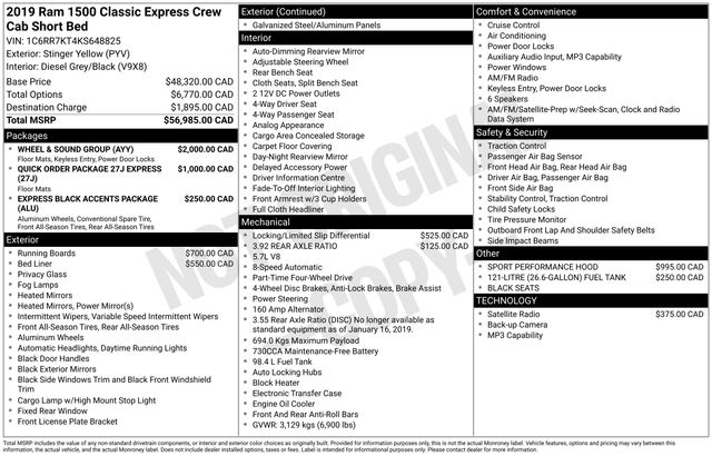 4x4 Flat Black Badge, Black Exterior Truck Badging, Black Headlamp Bezels, Black RAM Head Tailgate Badge, Body Color Grille w/Black RAM's Head, Carpet Floor Covering, Cloth 40/20/40 Bench Seat, Express Black Accent Package, Express Value Package, Front Floor Mats, Radio: Uconnect 3 w/5" Display, Rear Floor Mats, Remote Keyless Entry w/All-Secure, Semi-Gloss Black Hub, Wheels: 20" x 8" Aluminum Chrome Clad, Wheels: 20" x 8" Semi-Gloss Black Aluminum, 1-Yr SiriusXM Radio Service, 17" x 7" Aluminum Wheels, 17" x 7" Steel Wheels, 32 Gallon Fuel Tank, 4-Wheel Disc Brakes, 40/20/40 Split Bench Seat, 5.0" Touchscreen Display, 6 Speakers, ABS brakes, Active Grille Shutters, Add Spray In Bedliner, Air Conditioning, AM/FM radio, Anti-Spin Differential Rear Axle, Auto-dimming Rear-View mirror, Black Exterior Mirrors, Black Seats, Black Tubular Side Steps, Body Color Front Fascia, Body Color Grille, Body Color Rear Bumper w/Step Pads, Brake assist, Center Hub, Delay-off headlights, Delete Class IV Receiver Hitch, Delete Spray In Bedliner, Driver door bin, Dual front impact airbags, Dual front side impact airbags, Electronic Shift, Electronic Stability Control, Exterior Mirrors w/Heating Element, For More Info, Call 800-643-2112, Front anti-roll bar, Front Armrest w/3 Cupholders, Front Center Armrest, Front Fog Lamps, Front wheel independent suspension, Fully automatic headlights, GPS Antenna Input, Heated door mirrors, Heavy Duty Vinyl 40/20/40 Split Bench Seat, Integrated Voice Command w/Bluetooth, Low tire pressure warning, Manual Adjust Seats, Media Hub (USB, AUX), No Satellite Coverage w/AK/HI, Occupant sensing airbag, Overhead airbag, Overhead Console, ParkView Rear Back-Up Camera, Passenger door bin, Power door mirrors, Power steering, Power windows, Quick Order Package 27J Express, Radio data system, Radio: 3.0, Ram 1500 Express, Rear anti-roll bar, Rear Folding Seat, Rear seat center armrest, Rear step bumper, Rear View Day/Night Mirror, Remote USB Port - Charge Only, SiriusXM Satellite Radio, Speed control, Storage Tray, Tachometer, Temperature & Compass Gauge, Tilt steering wheel, Tip Start, Traction control, Variably intermittent wipers, Voltmeter, 4x4 Flat Black Badge, Black Exterior Truck Badging, Black Headlamp Bezels, Black RAM Head Tailgate Badge, Body Color Grille w/Black RAM's Head, Carpet Floor Covering, Cloth 40/20/40 Bench Seat, Express Black Accent Package, Express Value Package, Front Floor Mats, Radio: Uconnect 3 w/5" Display, Rear Floor Mats, Remote Keyless Entry w/All-Secure, Semi-Gloss Black Hub, Wheels: 20" x 8" Aluminum Chrome Clad, Wheels: 20" x 8" Semi-Gloss Black Aluminum.
