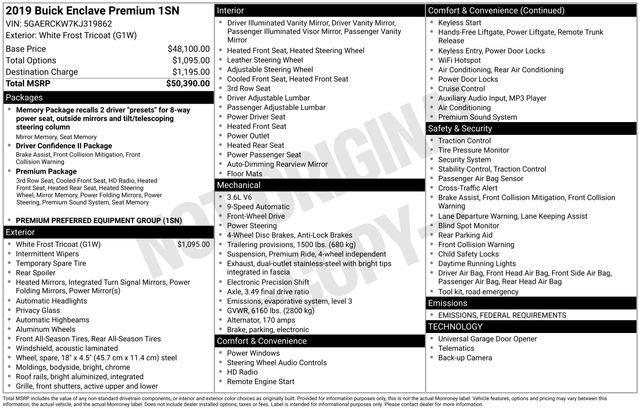120-Volt Power Outlet, 3rd Row 60/40 Power Fold Split-Bench, Automatic Heated Steering Wheel, Bose Performance-Enhanced 10-Speaker System, HD Radio, Heated 2nd Row Outboard Seats, Heated Driver & Front Passenger Seats, Memory Package, Navigation System, Outside Heated Power-Adjustable Mirrors, Power Tilt & Telescopic Steering Column, Premium Package, Ventilated Driver & Front Passenger Seats, 10 Speakers, 18" Painted Aluminum Wheels, 3.49 Axle Ratio, 3rd row seats: split-bench, 4-Wheel Disc Brakes, 7-Passenger Seating, ABS brakes, Air Conditioning, Alloy wheels, AM/FM radio: SiriusXM, Apple CarPlay/Android Auto, Audio memory, Auto High-beam Headlights, Auto tilt-away steering wheel, Auto-dimming door mirrors, Auto-dimming Rear-View mirror, Automatic temperature control, Brake assist, Bumpers: body-color, Compass, Delay-off headlights, Driver door bin, Driver vanity mirror, Dual front impact airbags, Dual front side impact airbags, Electronic Stability Control, Emergency communication system: OnStar and Buick connected services capable, Four wheel independent suspension, Front anti-roll bar, Front Bucket Seats, Front Center Armrest, Front dual zone A/C, Front reading lights, Fully automatic headlights, Garage door transmitter, Heated door mirrors, Heated front seats, Heated rear seats, Heated steering wheel, Illuminated entry, Leather steering wheel, Low tire pressure warning, Memory seat, Occupant sensing airbag, Outside temperature display, Overhead airbag, Overhead console, Panic alarm, Passenger door bin, Passenger vanity mirror, Perforated Leather-Appointed Seat Trim, Power door mirrors, Power Driver Lumbar Control Seat Adjuster, Power driver seat, Power Liftgate, Power Passenger Lumbar Control Seat Adjuster, Power passenger seat, Power steering, Power windows, Preferred Equipment Group 1SN, Premium audio system: Buick Infotainment System, Radio data system, Radio: Buick Infotainment System AM/FM Stereo, Rear air conditioning, Rear anti-roll bar, Rear reading lights, Rear window defroster, Rear window wiper, Remote keyless entry, Roof rack: rails only, Security system, SiriusXM Radio, Speed control, Speed-sensing steering, Spoiler, Steering wheel memory, Steering wheel mounted audio controls, Tachometer, Telescoping steering wheel, Tilt steering wheel, Traction control, Trip computer, Turn signal indicator mirrors, Variably intermittent wipers, Ventilated front seats, Voltmeter, 120-Volt Power Outlet, 3rd Row 60/40 Power Fold Split-Bench, Automatic Heated Steering Wheel, Bose Performance-Enhanced 10-Speaker System, HD Radio, Heated 2nd Row Outboard Seats, Heated Driver & Front Passenger Seats, Memory Package, Navigation System, Outside Heated Power-Adjustable Mirrors, Power Tilt & Telescopic Steering Column, Premium Package, Ventilated Driver & Front Passenger Seats.
