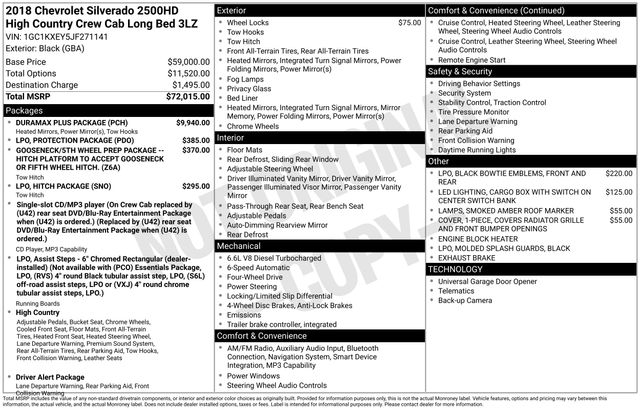 BOSE Sound w/6 Speaker System, Chrome Power-Adjustable Heated Trailering Mirrors, Chrome Recovery Hooks, Driver Alert Package, Duramax Plus Package, Engine Block Heater, Forward Collision Alert, Gooseneck/5th Wheel Prep Package, Lane Departure Warning System, Navigation System, Trailering Equipment, 1-Piece Radiator Grille/Front Bumper Opening Cover, 110-Volt AC Power Outlet, 4 Movable Upper Cargo Tie Downs, 4-Wheel Disc Brakes, 4.2" Diagonal Color Display Driver Info Center, 6" Rectangular Chromed Assist Steps (LPO), 7 Speakers, ABS brakes, Adjustable pedals, Air Conditioning, All-Weather Floor Liner (LPO), Alloy wheels, AM/FM radio: SiriusXM, Auto-dimming door mirrors, Auto-Dimming Inside Rear-View Mirror, Auto-dimming Rear-View mirror, Automatic temperature control, Black Molded Splash Guards (LPO), Black Recovery Hooks, Body-Color Front Bumper, Body-Color Rear Bumper, Bodyside moldings, Brake assist, Bright Sill Plates, Bumpers: body-color, Carpeted Front & Rear Floor Mats, CD player, Chevrolet Connected Access, Chevrolet w/4G LTE, Chrome Bodyside Moldings, Chrome Door Handles, Chrome Mirror Caps, Chrome wheels, Color-Keyed Carpeting Floor Covering, Compass, Deep-Tinted Glass, Delay-off headlights, Digital Steering Assist, Driver & Front Passenger Vanity Mirror Visors, Driver door bin, Driver vanity mirror, Dual front impact airbags, Dual front side impact airbags, Dual-Zone Automatic Climate Control, Electric Rear-Window Defogger, Electronic Shift Transfer Case, Electronic Stability Control, Exhaust Brake, Exterior Parking Camera Rear, EZ-Lift & Lower Tailgate, Floor Mounted Console, Front & Rear Black Bowtie Emblems (LPO), Front anti-roll bar, Front Bucket Seats, Front Center Armrest w/Storage, Front dual zone A/C, Front fog lights, Front Halogen Fog Lamps, Front reading lights, Front wheel independent suspension, Fully automatic headlights, Garage door transmitter, HD Radio, Heated & Vented Front Seating, Heated door mirrors, Heated Driver & Front Passenger Seating, Heated Front Full Feature Bucket Seats, Heated front seats, Heated Leather Wrapped Steering Wheel, Heated Power-Adjustable Outside Mirrors, Heated steering wheel, Hitch Package (LPO), Illuminated entry, Integrated Trailer Brake Controller, Leather-Wrapped Steering Wheel, LED Cargo Box Lighting, Low tire pressure warning, Manual Tilt-Wheel/Telescoping Steering Column, Memory seat, Occupant sensing airbag, OnStar & Chevrolet Connected Services Capable, Outside temperature display, Overhead airbag, Overhead console, Panic alarm, Passenger door bin, Passenger vanity mirror, Perforated Leather Appointed Seat Trim, Power door mirrors, Power driver seat, Power passenger seat, Power Sliding Rear Window w/Defogger, Power steering, Power windows, Power Windows w/Driver Express Up & Down, Power-Adjustable Pedals, Preferred Equipment Group 3LZ, Premium audio system: Chevrolet MyLink, Protection Package, Radio: AM/FM Stereo w/Chevrolet MyLink/Navigation, Rear 60/40 Folding Bench Seat (Folds Up), Rear reading lights, Rear seat center armrest, Rear step bumper, Rear Wheelhouse Liners, Rear window defroster, Remote Keyless Entry, Remote keyless entry, Remote Locking Tailgate, Remote Vehicle Starter System, Security system, Single Slot CD/MP3 Player, Siri