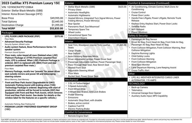 Automatic Dual-Zone Climate Control, Automatic Emergency Braking, Bose Performance Series 14-Speaker System, Dual Driver Info Center Display Gauge Cluster, Front & Rear Park Assist, HD Rear Vision Camera, Inside Rear-View Auto-Dimming Mirror, Navigation System, Premium Luxury Package 1SC, Teen Driver, 14 Speakers, 170 Amp Alternator, 2-Way Power Driver Lumbar Control Seat Adjuster, 2-Way Power Passenger Lumbar Control Seat Adjuster, 3.47 Axle Ratio, 4-Wheel Disc Brakes, 4-Wheel Independent Suspension, ABS brakes, Air Conditioning, All-Weather Integrated Cargo Liner (LPO), Alloy wheels, AM/FM radio: SiriusXM, Audio memory, Auto High-beam Headlights, Auto-dimming door mirrors, Auto-dimming Rear-View mirror, Automatic Stop/Start w/Disable, Automatic temperature control, Bodyside moldings, Brake assist, Bumpers: body-color, Compass, Delay-off headlights, Driver door bin, Driver vanity mirror, Dual front impact airbags, Dual front side impact airbags, Electronic Stability Control, Emergency communication system: OnStar and Cadillac connected services capable, Floor Liner Package (LPO), Four wheel independent suspension, Front & Rear All-Weather Floor Liners (LPO), Front anti-roll bar, Front Bucket Seats, Front Center Armrest, Front dual zone A/C, Front reading lights, Fully automatic headlights, Garage door transmitter, Genuine wood dashboard insert, Genuine wood door panel insert, Heated door mirrors, Heated Driver & Front Passenger Seats, Heated front seats, Heated steering wheel, Illuminated entry, Knee airbag, Leather Seating Surfaces w/Mini Perforated Inserts, Leather steering wheel, Low tire pressure warning, Memory seat, Occupant sensing airbag, Outside temperature display, Overhead airbag, Overhead console, Panic alarm, Passenger door bin, Passenger vanity mirror, Power door mirrors, Power driver seat, Power Liftgate, Power moonroof: UltraView, Power passenger seat, Power steering, Power windows, Radio data system, Radio: Cadillac User Experience w/Embedded Nav, Rain sensing wipers, Rear anti-roll bar, Rear reading lights, Rear seat center armrest, Rear window defroster, Rear window wiper, Remote keyless entry, Security system, SiriusXM w/360L, Speed control, Speed-sensing steering, Split folding rear seat, Spoiler, Steering wheel memory, Steering wheel mounted audio controls, Tachometer, Telescoping steering wheel, Tilt steering wheel, Traction control, Trip computer, Turn signal indicator mirrors, Variably intermittent wipers, Voltmeter, Wheels: 18" 6-Split Spoke Alloy, Wireless Apple CarPlay/Wireless Android Auto, Automatic Dual-Zone Climate Control, Automatic Emergency Braking, Bose Performance Series 14-Speaker System, Dual Driver Info Center Display Gauge Cluster, Front & Rear Park Assist, HD Rear Vision Camera, Inside Rear-View Auto-Dimming Mirror, Navigation System, Premium Luxury Package 1SC, Teen Driver.