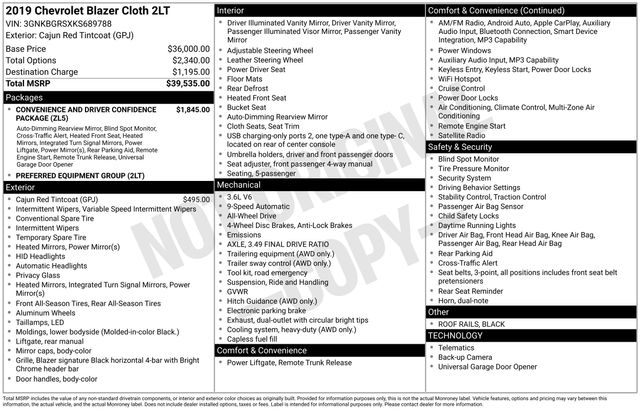 Black Roof Rails, Convenience & Driver Confidence Package, Heated Driver & Front Passenger Seats, Inside Rear-View Auto-Dimming Mirror, Lane Change Alert w/Side Blind Zone Alert, Outside Heated Power-Adjustable Body-Color Mirrors, Rear Cross Traffic Alert, Rear Park Assist w/Audible Warning, Rear Power Programmable Liftgate, Remote Vehicle Starter System, Universal Home Remote, 170 Amp Alternator, 3.49 Final Drive Ratio, 4-Wheel Disc Brakes, 6 Speakers, 6-Speaker Audio System Feature, ABS brakes, Air Conditioning, Alloy wheels, AM/FM radio: SiriusXM, Apple CarPlay/Android Auto, Automatic temperature control, Brake assist, Bumpers: body-color, Child-Seat-Sensing Airbag, Compass, Delay-off headlights, Driver door bin, Driver vanity mirror, Dual front impact airbags, Dual front side impact airbags, Electronic Stability Control, Emergency communication system: OnStar and Chevrolet connected services capable, Four wheel independent suspension, Front anti-roll bar, Front Bucket Seats, Front Center Armrest, Front dual zone A/C, Front reading lights, Fully automatic headlights, Heated door mirrors, Heavy-Duty Cooling System, High-Intensity Discharge Headlights, Illuminated entry, Knee airbag, Leather Shift Knob, Low tire pressure warning, Occupant sensing airbag, Outside temperature display, Overhead airbag, Overhead console, Panic alarm, Passenger door bin, Passenger vanity mirror, Power door mirrors, Power driver seat, Power steering, Power windows, Preferred Equipment Group 2LT, Premium Cloth Seat Trim, Radio data system, Radio: Chevrolet Infotainment 3 System, Rear anti-roll bar, Rear reading lights, Rear seat center armrest, Rear window defroster, Rear window wiper, Remote keyless entry, Ride & Handling Suspension, Security system, Speed control, Speed-sensing steering, Split folding rear seat, Spoiler, Steering wheel mounted audio controls, Tachometer, Telescoping steering wheel, Tilt steering wheel, Traction control, Trailer Sway Control, Trailering Assist Guidelines, Trailering Equipment, Trip computer, Variably intermittent wipers, Voltmeter, Wheels: 18" Bright Silver Aluminum, Black Roof Rails, Convenience & Driver Confidence Package, Heated Driver & Front Passenger Seats, Inside Rear-View Auto-Dimming Mirror, Lane Change Alert w/Side Blind Zone Alert, Outside Heated Power-Adjustable Body-Color Mirrors, Rear Cross Traffic Alert, Rear Park Assist w/Audible Warning, Rear Power Programmable Liftgate, Remote Vehicle Starter System, Universal Home Remote.
