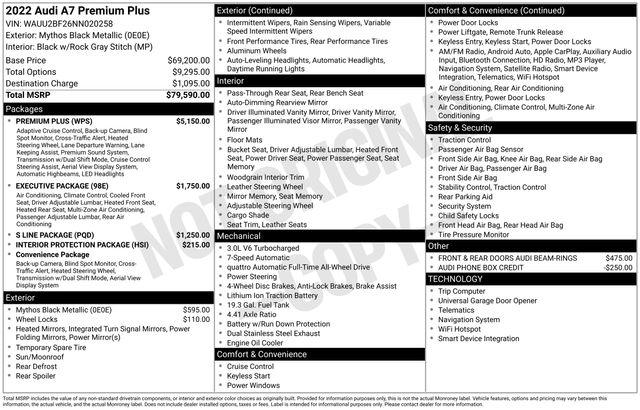 4-Zone Automatic Climate Control, Audi Phone Box w/Wireless Charging, Audi Side Assist w/Pre Sense Rear, Contour/Ambient LED Interior Lighting Package, Convenience Package, Executive Package, Front Seats w/Ventilation, Heated 3-Spoke Multifunction Steering Wheel, Heated Rear Seats, Illuminated S Line Door Sills, Navigation system: MMI Navigation plus, S Line Fender Badge, S-Line Package, Sport Suspension, Top View Camera System w/Virtual 360 View, 10 Speakers, 4-Wheel Disc Brakes, ABS brakes, Adaptive Cruise Assist w/Lane Guidance, Air Conditioning, Alloy wheels, AM/FM radio: SiriusXM, Audi Guard Wheel Lock Kit, Audi Phone Box Credit, Auto High-beam Headlights, Auto tilt-away steering wheel, Auto-dimming door mirrors, Auto-dimming Rear-View mirror, Automatic temperature control, Bang & Olufsen 3D Premium Sound System, Brake assist, Bumpers: body-color, Compass, Contrast Stitching on Door Armrests, Delay-off headlights, Driver door bin, Driver vanity mirror, Dual front impact airbags, Dual front side impact airbags, Electronic Stability Control, Emergency communication system: Audi connect CARE, Exterior Parking Camera Rear, Four wheel independent suspension, Front & Rear Doors Audi Beam-Rings, Front anti-roll bar, Front Bucket Seats, Front Center Armrest, Front dual zone A/C, Front fog lights, Front reading lights, Garage door transmitter: HomeLink, Genuine wood console insert, Genuine wood dashboard insert, Genuine wood door panel insert, HD Matrix-Design LED Headlights w/High Beam Assist, Heated door mirrors, Heated Front Bucket Seats, Heated front seats, Illuminated entry, Interior Protection Package, Knee airbag, Leather Seating Surfaces, Leather Shift Knob, LED Taillights w/Dynamic Indicators & Animation, Low tire pressure warning, Memory seat, Occupant sensing airbag, Outside temperature display, Overhead airbag, Overhead console, Panic alarm, Passenger door bin, Passenger vanity mirror, Power door mirrors, Power driver seat, Power Liftgate, Power moonroof, Power passenger seat, Power steering, Power windows, Premium Plus, Radio data system, Radio: MMI Navigation Plus, Rain sensing wipers, Rear air conditioning, Rear anti-roll bar, Rear fog lights, Rear reading lights, Rear seat center armrest, Rear side impact airbag, Rear window defroster, Remote keyless entry, Security system, Speed control, Speed-sensing steering, Speed-Sensitive Wipers, Split folding rear seat, Spoiler, Steering wheel memory, Steering wheel mounted audio controls, Tachometer, Telescoping steering wheel, Tilt steering wheel, Traction control, Trip computer, Turn signal indicator mirrors, Variably intermittent wipers, Wheels: 20" 5-Twin-Arm Design, 4-Zone Automatic Climate Control, Audi Phone Box w/Wireless Charging, Audi Side Assist w/Pre Sense Rear, Contour/Ambient LED Interior Lighting Package, Convenience Package, Executive Package, Front Seats w/Ventilation, Heated 3-Spoke Multifunction Steering Wheel, Heated Rear Seats, Illuminated S Line Door Sills, Navigation system: MMI Navigation plus, S Line Fender Badge, S-Line Package, Sport Suspension, Top View Camera System w/Virtual 360 View.