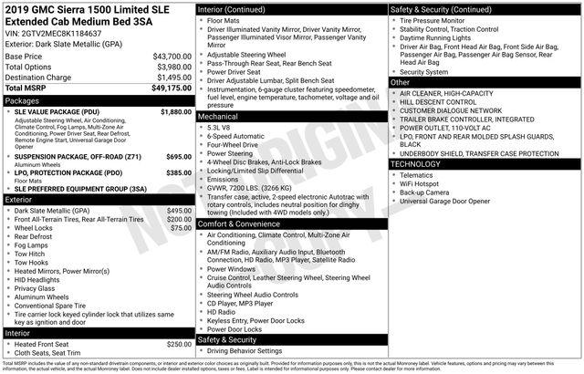 10-Way Power Driver's Seat Adjuster, 110-Volt AC Power Outlet, Dual-Zone Automatic Climate Control, Electric Rear-Window Defogger, Integrated Trailer Brake Controller, Manual Tilt/Telescoping Steering Column, Remote Vehicle Starter System, SLE Value Package, Thin Profile LED Fog Lamps, Universal Home Remote, 150 Amp Alternator, 3.42 Rear Axle Ratio, 4-Wheel Disc Brakes, 4.2" Diagonal Color Display Driver Info Center, 40/20/40 Front Split Bench Seat, 4X4 Chrome Badge, 6 Speakers, 6-Speaker Audio System, ABS brakes, Air Conditioning, All-Weather Floor Liner (LPO), Alloy wheels, AM/FM radio: SiriusXM, Body Color Bodyside Moldings, Body Color Door Handles, Body Color Power Adjustable Heated Outside Mirrors, Body-Color Mirror Caps, Bodyside moldings, Brake assist, Bumpers: chrome, CD player, Cloth Seat Trim, Color-Keyed Carpeting Floor Covering, Compass, Deep-Tinted Glass, Delay-off headlights, Driver & Front Passenger Visors, Driver door bin, Driver vanity mirror, Dual front impact airbags, Dual front side impact airbags, Electronic Stability Control, Emergency communication system: OnStar and GMC connected services capable, Exterior Parking Camera Rear, Front & Rear Molded Black Splash Guards (LPO), Front anti-roll bar, Front Center Armrest w/Storage, Front Frame-Mounted Black Recovery Hooks, Front reading lights, Front wheel independent suspension, Fully automatic headlights, GMC 4G LTE, GMC Connected Access, HD Radio, Heated door mirrors, Heated Driver & Front Passenger Seats, Heavy Duty Suspension, High-Intensity Discharge Headlights, Hill Descent Control, Illuminated entry, Leather-Wrapped Steering Wheel w/Audio/Cruise Ctrls, LED Cargo Box Lighting, Low tire pressure warning, Occupant sensing airbag, Off-Road Suspension Package, OnStar & GMC Connected Services Capable, Outside temperature display, Overhead airbag, Overhead console, Panic alarm, Passenger door bin, Passenger vanity mirror, Power door mirrors, Power steering, Power windows, Preferred Equipment Group 3SA, Premium audio system: GMC Infotainment System, Protection Package, Radio data system, Radio: AM/FM/SiriusXM w/GMC Infotainment System, Rear 60/40 Folding Bench Seat (Folds Up), Rear reading lights, Rear step bumper, Rear Wheelhouse Liners, Remote Keyless Entry, Remote keyless entry, Remote Locking Tailgate, Rubberized-Vinyl Front Floor Mats, Rubberized-Vinyl Rear Floor Mats, Single Slot CD/MP3 Player, Single-Zone Air Conditioning, SiriusXM Radio, Speed control, Speed-sensing steering, Split folding rear seat, Steering Wheel Audio Controls, Steering wheel mounted audio controls, Tachometer, Theft Deterrent System (Unauthorized Entry), Tilt steering wheel, Traction control, Trip computer, Variably intermittent wipers, Voltmeter, Wheel Locks (Set of 4) (LPO), Wheels: 17" x 8" Bright Machined Aluminum, Wheels: 18" x 8.5" Bright Machined Aluminum, 10-Way Power Driver's Seat Adjuster, 110-Volt AC Power Outlet, Dual-Zone Automatic Climate Control, Electric Rear-Window Defogger, Integrated Trailer Brake Controller, Manual Tilt/Telescoping Steering Column, Remote Vehicle Starter System, SLE Value Package, Thin Profile LED Fog Lamps, Universal Home Remote.
