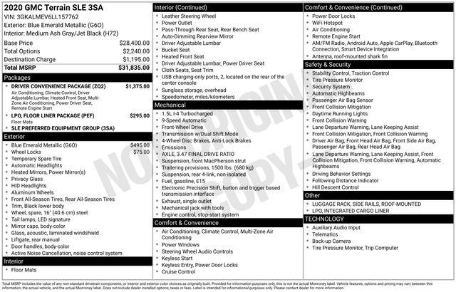 8-Way Power Driver Seat Adjuster, Driver & Front Passenger Heated Seats, Driver Convenience Package, Dual-Zone Automatic Climate Control, Remote Start, Roof-Mounted Luggage Rack Black Side Rails, 2 USB Data Ports w/Auxiliary Input Jack, 3.47 Axle Ratio, 4-Way Manual Driver's Seat, 4-Way Manual Front Passenger Seat, 4-Wheel Disc Brakes, 6 Speakers, 6-Speaker Audio System Feature, ABS brakes, Air Conditioning, Alloy wheels, AM/FM radio, Apple CarPlay/Android Auto, Auto High-beam Headlights, Auto-dimming Rear-View mirror, Bluetooth® For Phone, Brake assist, Bumpers: body-color, Compass, Delay-off headlights, Driver door bin, Driver vanity mirror, Dual front impact airbags, Dual front side impact airbags, Electronic Stability Control, Emergency communication system: OnStar and GMC connected services capable, Exterior Parking Camera Rear, Floor Liner Package (LPO), Four wheel independent suspension, Front & Rear All-Weather Floor Liners (LPO), Front anti-roll bar, Front Bucket Seats, Front Center Armrest, Front reading lights, Fully automatic headlights, Heated door mirrors, High-Intensity Discharge Headlights, Illuminated entry, Integrated Cargo Liner (LPO), Low tire pressure warning, Occupant sensing airbag, Outside temperature display, Overhead airbag, Overhead console, Panic alarm, Passenger door bin, Passenger vanity mirror, Power door mirrors, Power Driver Lumbar Control, Power steering, Power windows, Preferred Equipment Group 3SA, Premium Cloth Seat Trim, Radio data system, Radio: GMC Infotainment Audio System w/7" Display, Rear anti-roll bar, Rear seat center armrest, Rear window defroster, Rear window wiper, Remote keyless entry, Security system, Speed control, Speed-sensing steering, Split folding rear seat, Spoiler, Steering wheel mounted audio controls, Tachometer, Telescoping steering wheel, Tilt steering wheel, Traction control, Trip computer, Variably intermittent wipers, Wheel Locks, Wheels: 17" x 7" Silver Painted Aluminum, 8-Way Power Driver Seat Adjuster, Driver & Front Passenger Heated Seats, Driver Convenience Package, Dual-Zone Automatic Climate Control, Remote Start, Roof-Mounted Luggage Rack Black Side Rails.