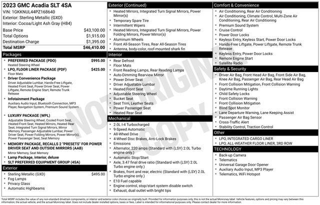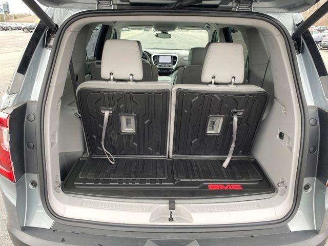 8-Way Power Passenger Seat Adjuster, Heated & Ventilated Driver & Front Passenger Seats, Heated Rear Outboard Seating Positions, Luxury Package, Memory Package, Navigation System, Power Passenger Lumbar Control Seat Adjuster, Power Tilt & Telescopic Steering Column, Power-Adjustable Body-Color Outside Heated Mirrors, 18" Aluminum Wheels, 1st & 2nd Row All-Weather Floor Liner (LPO), 3.47 Final Drive Axle Ratio, 3rd Row All-Weather Floor Liner (LPO), 3rd row seats: split-bench, 4-Way Manual Passenger Seat Adjuster, 4-Wheel Disc Brakes, 6-Passenger (2-2-2 Seating Configuration), 8 Speakers, 8-Way Power Driver Seat Adjuster, ABS brakes, Air Conditioning, Alloy wheels, AM/FM radio: SiriusXM with 360L, Apple CarPlay/Android Auto, Auto High-beam Headlights, Auto-dimming Rear-View mirror, Automatic temperature control, Bose Premium 8-Speaker Audio System Feature, Brake assist, Bumpers: body-color, Compass, Delay-off headlights, Driver door bin, Driver vanity mirror, Dual front impact airbags, Dual front side impact airbags, Electronic Stability Control, Emergency communication system: OnStar and GMC connected services capable, Floor Liner Package (LPO), Four wheel independent suspension, Front anti-roll bar, Front Bucket Seats, Front Center Armrest, Front dual zone A/C, Front fog lights, Front reading lights, Fully automatic headlights, Garage door transmitter, Heated door mirrors, Heated Driver & Front Passenger Seats, Heated front seats, Heated Steering Wheel, Illuminated entry, Integrated Cargo Liner (LPO), Knee airbag, Low tire pressure warning, Occupant sensing airbag, Outside temperature display, Overhead airbag, Overhead console, Panic alarm, Passenger door bin, Passenger vanity mirror, Perforated Leather-Appointed Seat Trim, Power door mirrors, Power Driver Lumbar Control Seat Adjuster, Power driver seat, Power Liftgate, Power steering, Power windows, Preferred Equipment Group 4SA, Preferred Package, Radio data system, Radio: AM/FM 8" Diagonal Multi-Touch Navigation, Rear air conditioning, Rear anti-roll bar, Rear reading lights, Rear window defroster, Rear window wiper, Remote keyless entry, Roof rack: rails only, Security system, SiriusXM w/360L, Speed control, Speed-sensing steering, Spoiler, Steering wheel mounted audio controls, Tachometer, Telescoping steering wheel, Tilt steering wheel, Traction control, Trip computer, Turn signal indicator mirrors, Variably intermittent wipers, Voltmeter, Wireless Apple CarPlay/Wireless Android Auto, 8-Way Power Passenger Seat Adjuster, Heated & Ventilated Driver & Front Passenger Seats, Heated Rear Outboard Seating Positions, Luxury Package, Memory Package, Navigation System, Power Passenger Lumbar Control Seat Adjuster, Power Tilt & Telescopic Steering Column, Power-Adjustable Body-Color Outside Heated Mirrors.