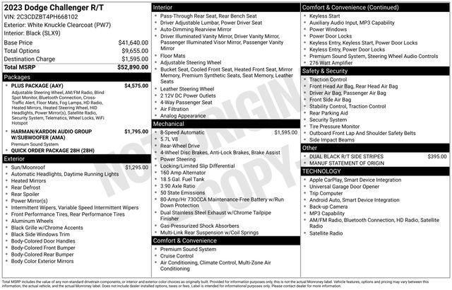 This 2023 Dodge Challenger R/T is equipped with a powerful HEMI 5.7L V8 engine, delivering an impressive 16 MPG in the city and 25 MPG on the highway. Standout features include: