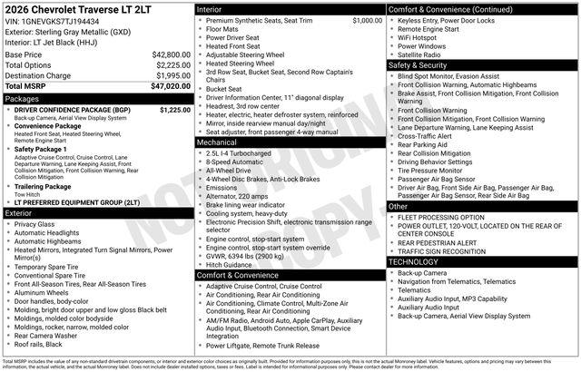 3rd row seats: split-bench, 4-Way Manual Front Passenger Seat Adjuster, 4-Wheel Disc Brakes, 6 Speakers, 6-Speaker Audio System Feature, 8-Way Power Driver Seat Adjuster, ABS brakes, Air Conditioning, Alloy wheels, AM/FM radio: SiriusXM with 360L, Apple CarPlay/Android Auto, Auto High-beam Headlights, Automatic temperature control, Brake assist, Bumpers: body-color, Child-Seat-Sensing Airbag, Compass, Delay-off headlights, Driver Confidence Package, Driver door bin, Driver vanity mirror, Dual front impact airbags, Dual front side impact airbags, Electronic Stability Control, Emergency communication system: OnStar, Four wheel independent suspension, Front anti-roll bar, Front Bucket Seats, Front Center Armrest, Front dual zone A/C, Front reading lights, Fully automatic headlights, HD Surround Vision, Heated door mirrors, Heated Driver and Front Passenger Seats, Heated front seats, Heated steering wheel, Illuminated entry, Key Card, Low tire pressure warning, Navigation System, Occupant sensing airbag, Outside temperature display, Overhead airbag, Overhead console, Panic alarm, Passenger door bin, Passenger vanity mirror, Power door mirrors, Power driver seat, Power Liftgate, Power Outlet, Power steering, Power windows, Preferred Equipment Group 2LT, Premium Cloth Seat Trim, Radio data system, Radio: : Audio System w/17.7" Diagonal Display, Rear air conditioning, Rear anti-roll bar, Rear Camera Mirror, Rear Pedestrian Alert, Rear reading lights, Rear window defroster, Rear window wiper, Remote keyless entry, Security system, SiriusXM with 360L Trial Subscription, Speed control, Speed-sensing steering, Spoiler, Steering wheel mounted audio controls, Tachometer, Telescoping steering wheel, Tilt steering wheel, Traction control, Traffic Sign Recognition, Trip computer, Turn signal indicator mirrors, Variably intermittent wipers, Voltmeter, Wheels: 18" Grazen Metallic Machined-Face Aluminum.