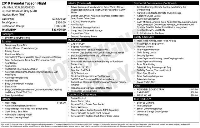 4-Wheel Disc Brakes, 8 Speakers, ABS brakes, Air Conditioning, Alloy wheels, AM/FM radio: SiriusXM, Apple CarPlay & Android Auto, Auto High-beam Headlights, Auto-dimming Rear-View mirror, Automatic temperature control, Axle Ratio: 3.195, Brake assist, Bumpers: body-color, Cargo Net, Carpeted Floor Mats, Cloth Seat Trim, Delay-off headlights, Driver door bin, Driver vanity mirror, Dual front impact airbags, Dual front side impact airbags, Electronic Stability Control, Emergency communication system: Blue Link, Exterior Parking Camera Rear, First Aid Kit, Four wheel independent suspension, Front anti-roll bar, Front Bucket Seats, Front Center Armrest, Front dual zone A/C, Front fog lights, Front reading lights, Fully automatic headlights, Garage door transmitter: HomeLink, Heated door mirrors, Heated Front Bucket Seats, Heated front seats, Illuminated entry, Leather Shift Knob, Low tire pressure warning, Occupant sensing airbag, Option Group 01, Outside temperature display, Overhead airbag, Overhead console, Panic alarm, Passenger door bin, Passenger vanity mirror, Power door mirrors, Power driver seat, Power Liftgate, Power moonroof, Power steering, Power windows, Radio: Infinity Audio System, Rear anti-roll bar, Rear seat center armrest, Rear window defroster, Rear window wiper, Remote keyless entry, Reversible Cargo Tray, Roof rack: rails only, Security system, Speed control, Speed-sensing steering, Split folding rear seat, Spoiler, Steering wheel mounted audio controls, Tachometer, Telescoping steering wheel, Tilt steering wheel, Traction control, Trip computer, Variably intermittent wipers, Wheels: 19" BBS Alloy w/Black Satin-Finish.