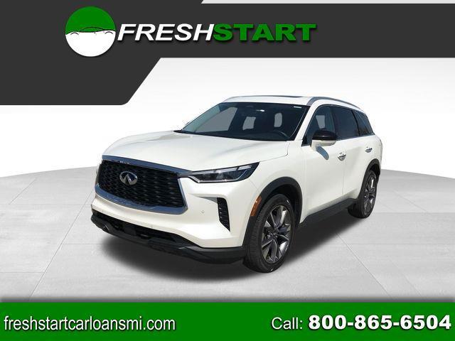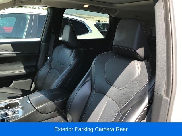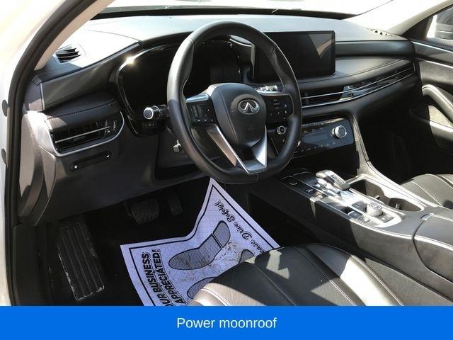 Apple CarPlay/Android Auto, Exterior Parking Camera Rear, Navigation system: INFINITI InTouch Navigation, Power Liftgate, Power moonroof, Speed control, Wheels: 20" x 8J Sporty Machined Aluminum Alloy, 3rd row seats: bench, 4-Wheel Disc Brakes, 4.33 Axle Ratio, 9 Speakers, ABS brakes, Air Conditioning, Alloy wheels, AM/FM radio: SiriusXM, Anti-whiplash front head restraints, Auto High-beam Headlights, Auto tilt-away steering wheel, Auto-dimming door mirrors, Auto-dimming Rear-View mirror, Automatic temperature control, Brake assist, Bumpers: body-color, Climate Controlled Front Bucket Seats, Delay-off headlights, Driver door bin, Driver vanity mirror, Dual front impact airbags, Dual front side impact airbags, Electronic Stability Control, Emergency communication system: INFINITI InTouch, Four wheel independent suspension, Front anti-roll bar, Front Bucket Seats, Front Center Armrest, Front dual zone A/C, Front reading lights, Fully automatic headlights, Garage door transmitter: HomeLink, Heated door mirrors, Heated front seats, Heated steering wheel, Illuminated entry, Knee airbag, Leather Shift Knob, Leather steering wheel, Leather-Appointed Seating Surfaces, Low tire pressure warning, Memory seat, Occupant sensing airbag, Outside temperature display, Overhead airbag, Overhead console, Panic alarm, Passenger door bin, Passenger vanity mirror, Power door mirrors, Power driver seat, Power passenger seat, Power steering, Power windows, Radio data system, Radio: AM/FM Audio System, Rain sensing wipers, Rear air conditioning, Rear anti-roll bar, Rear reading lights, Rear seat center armrest, Rear side impact airbag, Rear window defroster, Rear window wiper, Reclining 3rd row seat, Remote keyless entry, Security system, Speed-sensing steering, Speed-Sensitive Wipers, Split folding rear seat, Spoiler, Steering wheel memory, Steering wheel mounted audio controls, Tachometer, Telescoping steering wheel, Tilt steering wheel, Traction control, Trip computer, Turn signal indicator mirrors, Variably intermittent wipers, Ventilated front seats, Apple CarPlay/Android Auto, Exterior Parking Camera Rear, Navigation system: INFINITI InTouch Navigation, Power Liftgate, Power moonroof, Speed control, Wheels: 20" x 8J Sporty Machined Aluminum Alloy.