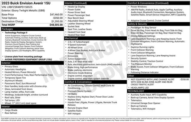 Powered by a responsive 2.0L Turbocharged engine paired with a smooth-shifting 9-Speed Automatic transmission, the Envision Avenir delivers an exhilarating yet efficient driving experience. With an EPA-estimated 22 city/29 highway MPG, you'll enjoy the perfect balance of power and fuel economy.