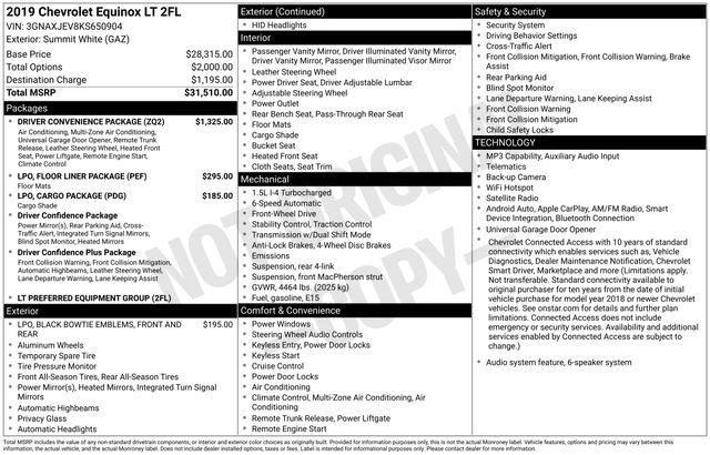 Apple CarPlay/Android Auto, Driver Confidence Package, Driver Confidence Plus Package, Preferred Equipment Group 2FL, Speed control, 17" Aluminum Wheels, 2 Rear USB Charging-Only Ports, 2 USB Ports & Auxiliary Input Jack, 2-Way Power Driver Lumbar Control Seat Adjuster, 3-Spoke Leather-Wrapped Steering Wheel, 3.50 Final Drive Axle Ratio, 4-Wheel Disc Brakes, 6 Speaker Audio System Feature, 6 Speakers, 8-Way Power Driver Seat Adjuster, ABS brakes, Air Conditioning, All-Weather Floor Liners (LPO), Alloy wheels, AM/FM radio: SiriusXM, Auto High-beam Headlights, Bluetooth® For Phone, Brake assist, Bumpers: body-color, Cargo Package (LPO), Compass, Delay-off headlights, Driver Convenience Package, Driver door bin, Driver vanity mirror, Dual front impact airbags, Dual front side impact airbags, Dual Zone Automatic Climate Control, Electronic Stability Control, Emergency communication system: OnStar and Chevrolet connected services capable, Floor Liner Package (LPO), Following Distance Indicator, Forward Collision Alert, Four wheel independent suspension, Front & Rear Black Bowtie Emblems (LPO), Front anti-roll bar, Front Bucket Seats, Front Center Armrest, Front Passenger 4-Way Manual Seat Adjuster, Front Pedestrian Braking, Front reading lights, Fully automatic headlights, Heated door mirrors, Heated Driver & Front Passenger Seats, High-Intensity Discharge Headlights, Illuminated entry, Integrated Cargo Liner (LPO), IntelliBeam Auto High Beam Headlamp Control, Lane Change Alert w/Side Blind Zone Alert, Lane Keep Assist w/Lane Departure Warning, Leather-Wrapped Shift Lever, Low Speed Forward Automatic Braking, Low tire pressure warning, Occupant sensing airbag, Outside Heated Power-Adjustable Mirrors, Outside temperature display, Overhead airbag, Overhead console, Panic alarm, Passenger door bin, Passenger vanity mirror, Power door mirrors, Power driver seat, Power steering, Power windows, Premium audio system: Chevrolet MyLink, Premium Cloth Seat Trim, Radio data system, Radio: Chevrolet Infotainment 3 System w/AM/FM, Rear anti-roll bar, Rear Cross Traffic Alert, Rear Park Assist w/Audible Warning, Rear Power Liftgate, Rear reading lights, Rear seat center armrest, Rear window defroster, Rear window wiper, Remote keyless entry, Remote Vehicle Starter System, Retractable Cargo Shade, Security system, SiriusXM Radio, Speed-sensing steering, Split folding rear seat, Spoiler, Steering wheel mounted audio controls, Tachometer, Telescoping steering wheel, Tilt steering wheel, Traction control, Trip computer, Turn signal indicator mirrors, Universal Home Remote, Variably intermittent wipers, Vertical Cargo Net (LPO), Apple CarPlay/Android Auto, Driver Confidence Package, Driver Confidence Plus Package, Preferred Equipment Group 2FL, Speed control.