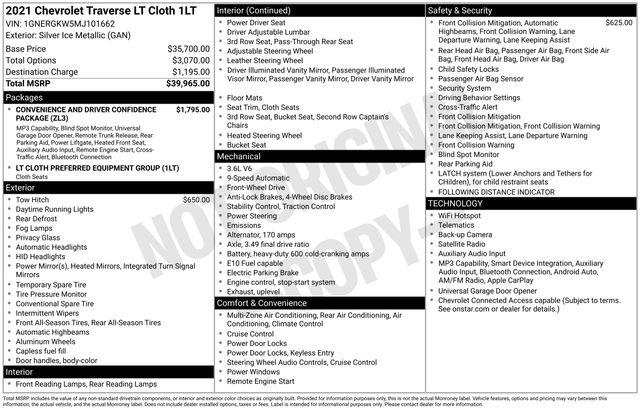4.2" Multi-Color Enhanced Driver Instrument Display, Automatic Emergency Braking, Automatic Heated Steering Wheel, Chevy Safety Assist, Convenience & Driver Confidence Package, Following Distance Indicator, Forward Collision Alert, Front Pedestrian Braking, Heated Driver & Front Passenger Seats, IntelliBeam Auto High Beam Control Headlamps, Lane Change Alert w/Side Blind Zone Alert, Lane Keep Assist w/Lane Departure Warning, Radio: Chevrolet Infotainment 3 Plus System, Rear Cross Traffic Alert, Rear Park Assist w/Audible Warning, Rear Power Liftgate, Remote Start, Universal Home Remote, 3.49 Axle Ratio, 3rd row seats: split-bench, 4-Wheel Disc Brakes, 6 Speakers, 7-Passenger Seating (2-2-3 Seating Configuration), ABS brakes, Air Conditioning, Alloy wheels, AM/FM radio: SiriusXM, Apple CarPlay/Android Auto, Automatic temperature control, Brake assist, Bumpers: body-color, Compass, Delay-off headlights, Driver door bin, Driver vanity mirror, Dual front impact airbags, Dual front side impact airbags, Electronic Stability Control, Emergency communication system: OnStar and Chevrolet connected services capable, Four wheel independent suspension, Front anti-roll bar, Front Bucket Seats, Front Center Armrest, Front dual zone A/C, Front fog lights, Front reading lights, Fully automatic headlights, Heated door mirrors, Heavy-Duty Cooling System, High-Intensity Discharge Headlights, Hitch Guidance w/Hitch View, Illuminated entry, Leather steering wheel, Low tire pressure warning, Occupant sensing airbag, Outside temperature display, Overhead airbag, Overhead console, Panic alarm, Passenger door bin, Passenger vanity mirror, Power door mirrors, Power driver seat, Power steering, Power windows, Preferred Equipment Group 1LT, Premium Cloth Seat Trim, Radio data system, Radio: Chevrolet Infotainment System AM/FM Stereo, Rear air conditioning, Rear anti-roll bar, Rear reading lights, Rear window defroster, Rear window wiper, Remote keyless entry, Roof rack: rails only, Security system, SiriusXM Radio, SiriusXM w/360L, Speed control, Speed-sensing steering, Spoiler, Steering wheel mounted audio controls, Tachometer, Telescoping steering wheel, Tilt steering wheel, Traction control, Trailering Assist Guidelines, Trailering Equipment, Trip computer, Turn signal indicator mirrors, Variably intermittent wipers, Voltmeter, Wheels: 18" Bright Silver Painted Aluminum, 4.2" Multi-Color Enhanced Driver Instrument Display, Automatic Emergency Braking, Automatic Heated Steering Wheel, Chevy Safety Assist, Convenience & Driver Confidence Package, Following Distance Indicator, Forward Collision Alert, Front Pedestrian Braking, Heated Driver & Front Passenger Seats, IntelliBeam Auto High Beam Control Headlamps, Lane Change Alert w/Side Blind Zone Alert, Lane Keep Assist w/Lane Departure Warning, Radio: Chevrolet Infotainment 3 Plus System, Rear Cross Traffic Alert, Rear Park Assist w/Audible Warning, Rear Power Liftgate, Remote Start, Universal Home Remote.